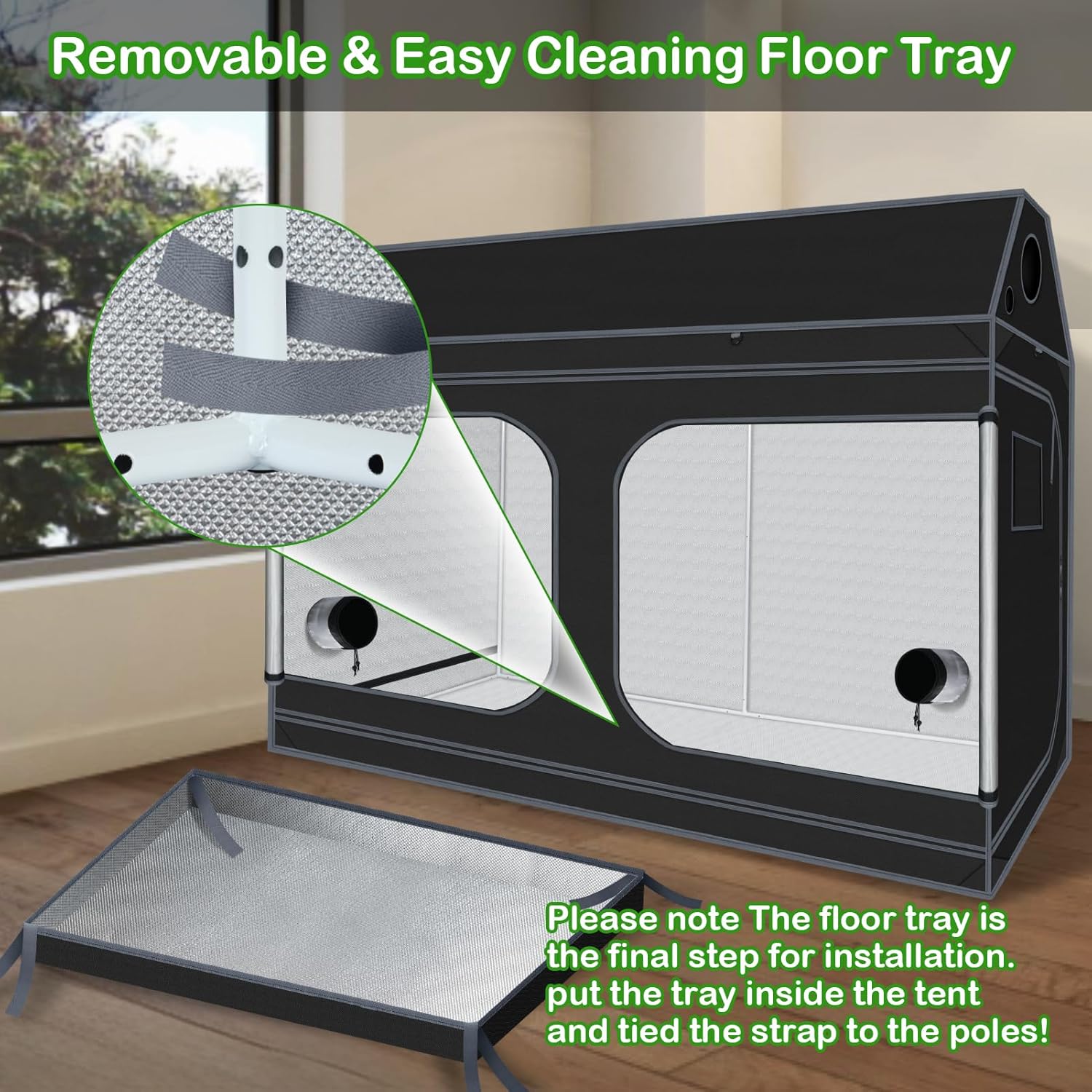 - Upgrade Design --- UPGRADED CONNECTOR--Durable PA Material Adopted, Anti-rust Reinforced Design, Adjustable Tightness According to The Pole, Hold Poles Tightly for Firmed Support. Multiple vents to accommodate fans and filter; ducting rectangle window with mesh to keep dust and insects out; Removable mylar floor tray easy to clean.