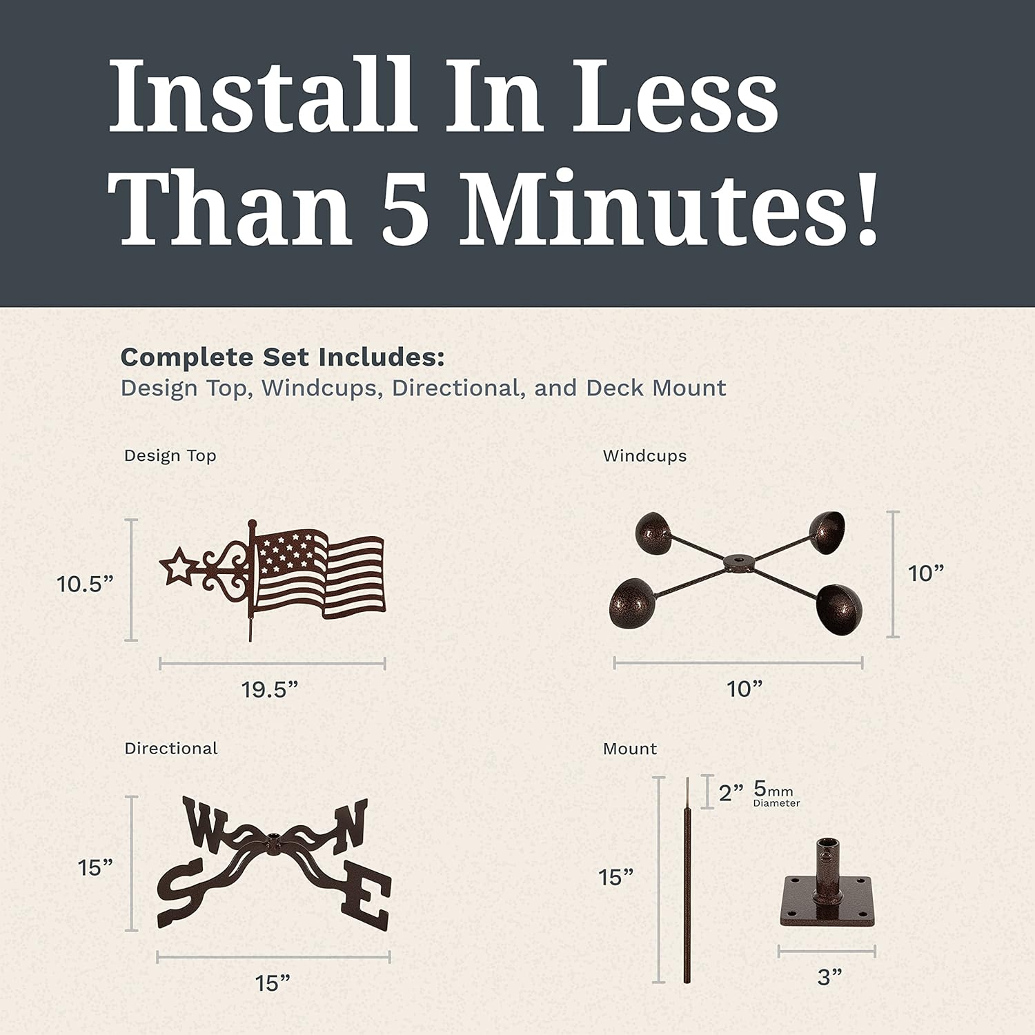 EZ Vane Steel USA Flag Weathervane 21” Height, Includes Metal Deck Mount, Wind Cups & Brackets | Hand-Crafted and Family-Owned, Made in The USA with Triple Powder Coating, Limited