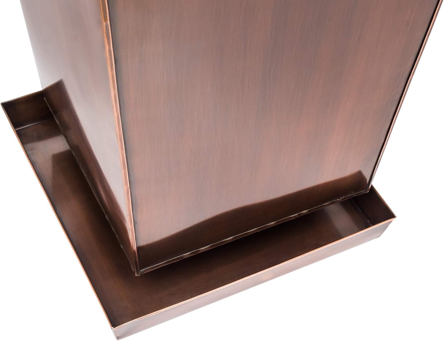 - Vertical Copper Planters: Large indoor outdoor flower planter is approximately 15 inches square at widest and 33 inches high, base of planter 10 inches wide and insert is 11 inches deep. Large drip tray approximately 12” square and 1.5” deep.