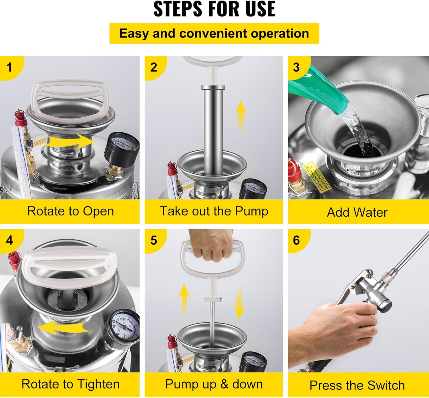 - Durable Stainless Steel: Capacity: 2 Gal; Pressure: 1.5-4.0 Bar. Our hand pump sprayer is made of stainless steel, rust-proof and durable. Pay attention that the rubber ring and internal design are not suitable for strong corrosive, acidic, and base solutions.