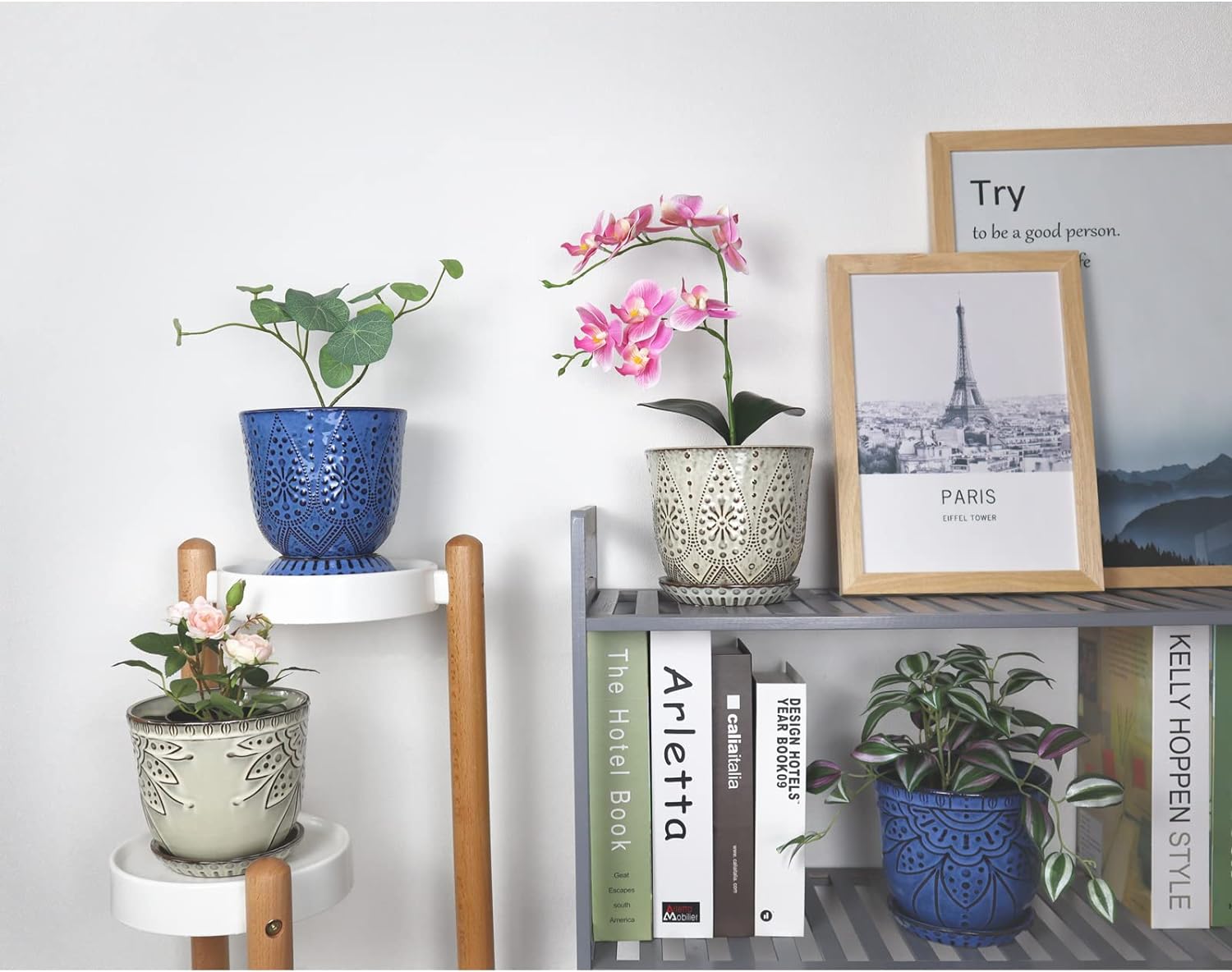Gepege 6 Inch Beaded Ceramic Planter Set of 2 with Drainage Hole and Saucer for Plants, Indoor-Outdoor Large Round Succulent Orchid Flower Pot (Blue, for Inner-pots not Larger Than 5 Inch)