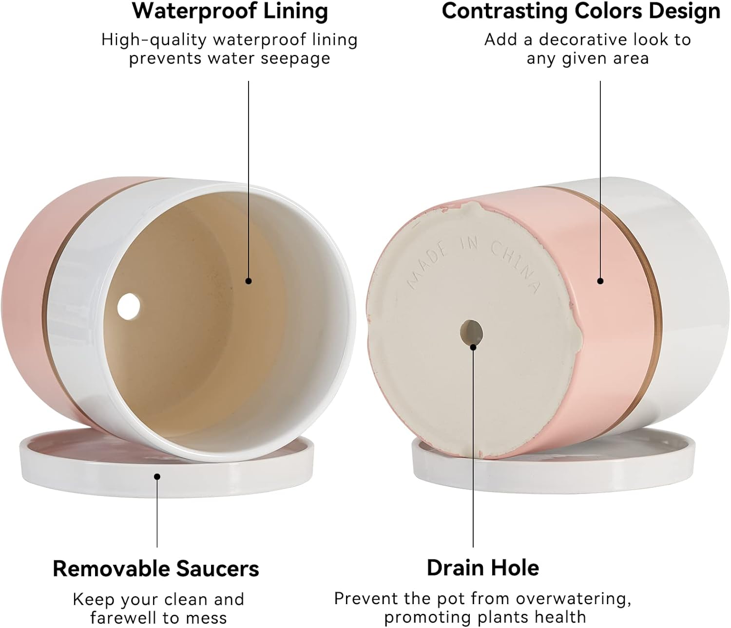 - 【Drain Hole & Saucer Tray】 Comes with a drain hole at the bottom, which can prevents the plant pot from overwatering, promoting plants health, and help them thrive. Saucer base for catching excess water without drips, works well for keep table clean
