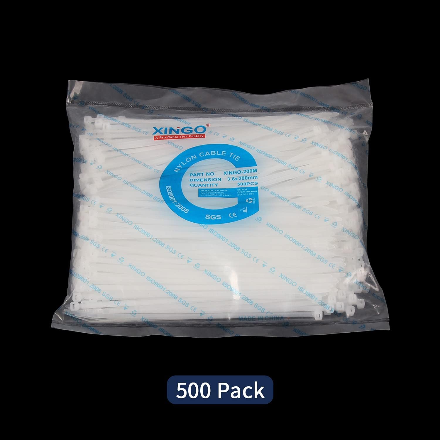XINGO 8 Inch White Cable Zip Ties (500 Pack), 40 Lbs Tensile Strength-Heavy Duty, Self-Locking Nylon Plastic Nylon Wire Ties for indoor and outdoor use