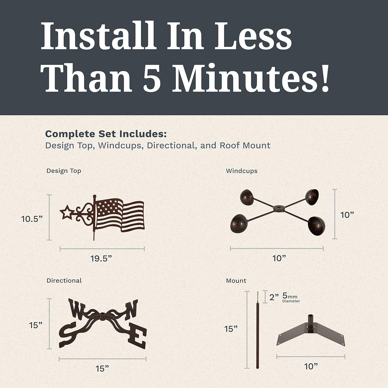 - Complete Kit – EZ Vane USA Flag weathervane includes an intricate laser-cut USA Flag design topper, roof mount, windcups with sealed ball bearings, and an EWNS indicator to show wind direction.