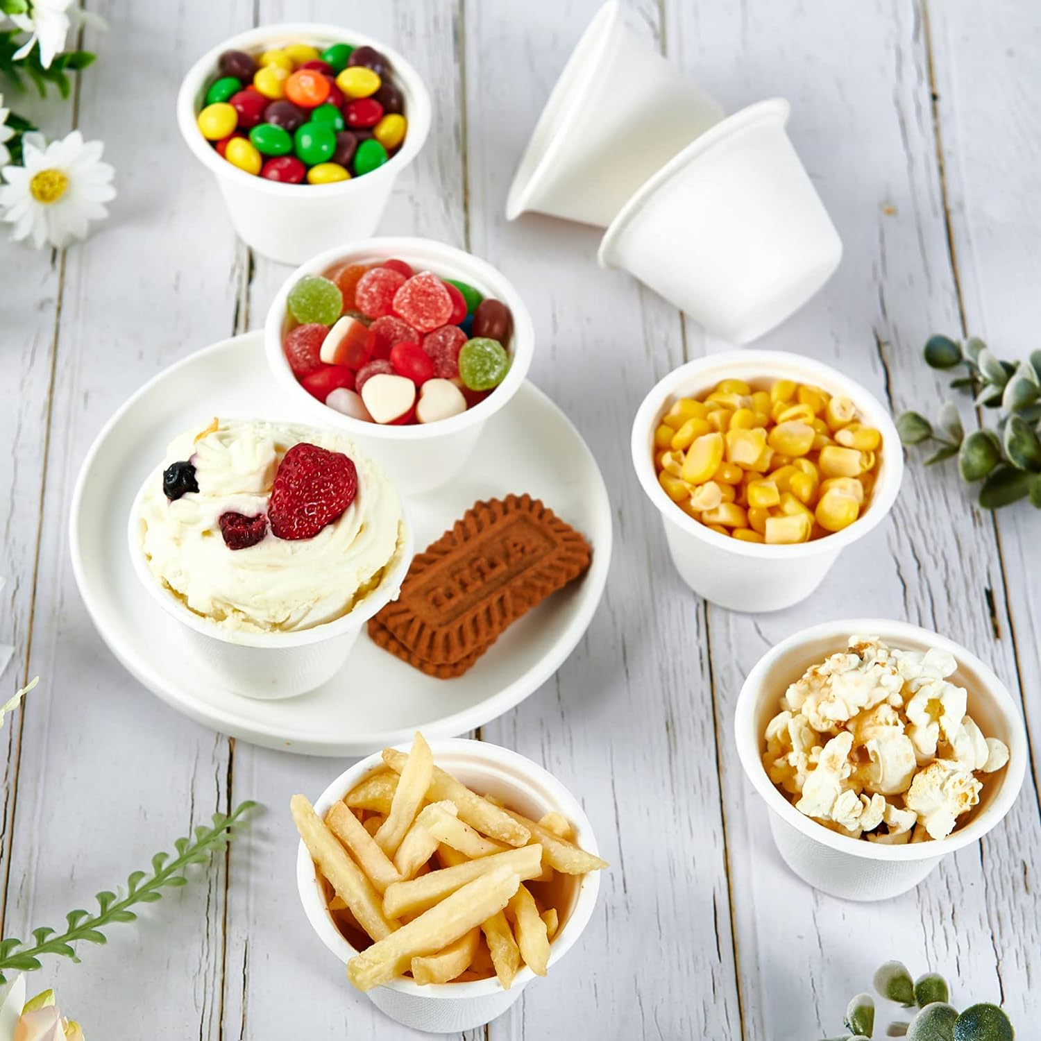 - Biodegradable Design: Our disposable portion cups are made of sugarcane which is 100% compostable. After use, you can put these bagasse cups into the compost bin. Helping you save plenty of cleaning time