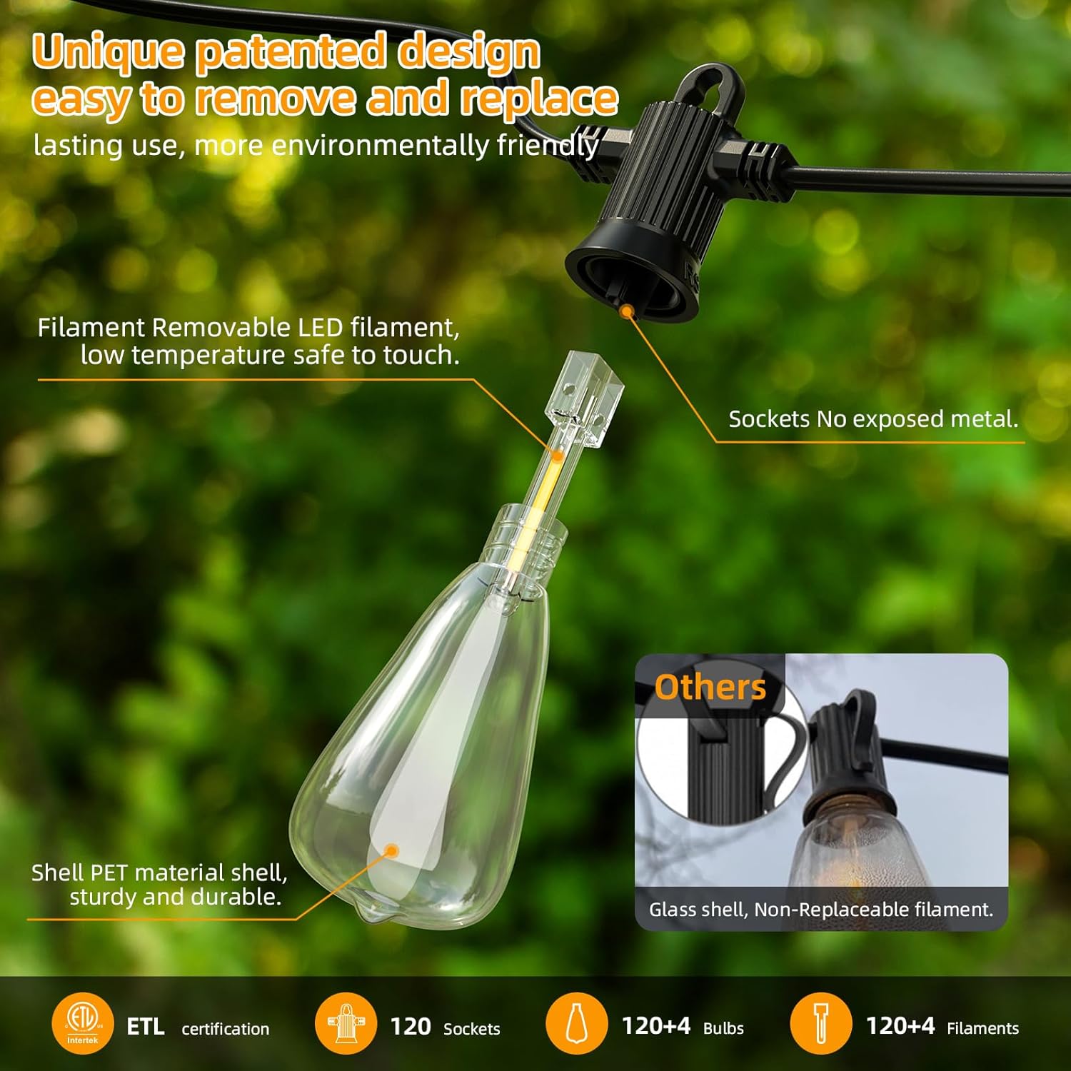 - PATENTED SAFETY AND DURABILITY: Our string lights feature a unique, patented design with removable filaments and shells technology to ensure safety and longevity. Simply unscrew the plastic shell and pull out the low-temperature filament for replacement, with no exposed metal or risk of electric shock, and no need to replace the entire bulb. This outside lights design reduces loss from bulb breakage, promotes sustainability by minimizing waste, and meets the concept of environmental protection.