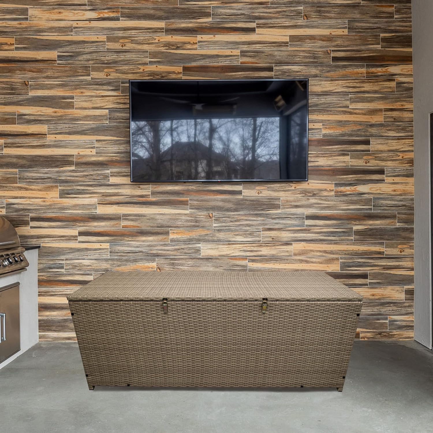 Oakland Living Tan Indoor and Outdoor Balcony Patio Deck Porch Pool 113 Gallon Wicker Storage Box Trunk Bin with Metal Frame
