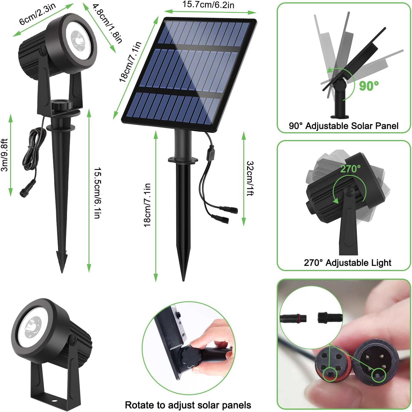 - 【2-IN-1 Install】Solar spotlights outdoor can be installed in the ground or mounted on the wall with included screws which have 9.8 ft/3m cable, 270°adjustable base can freely go up or down to meet different requirements.