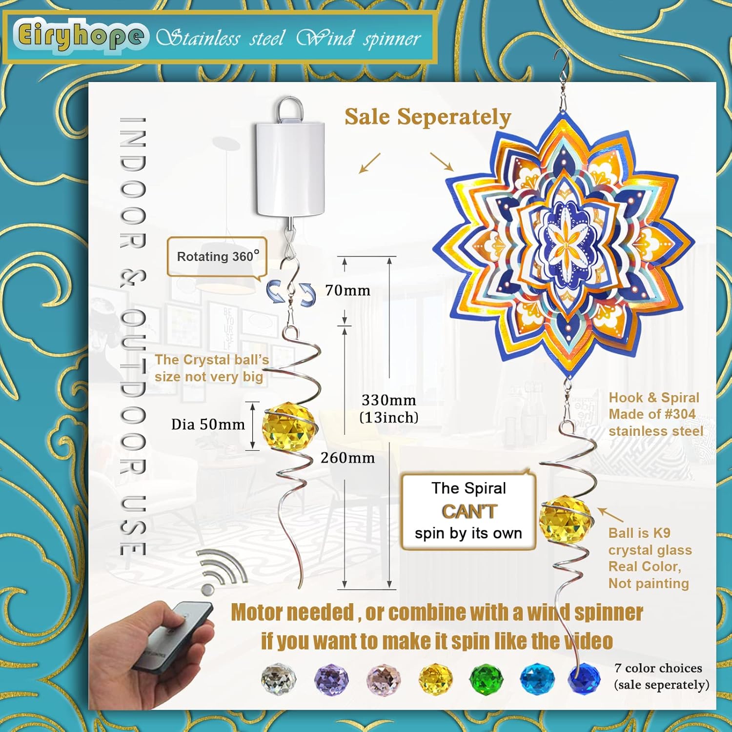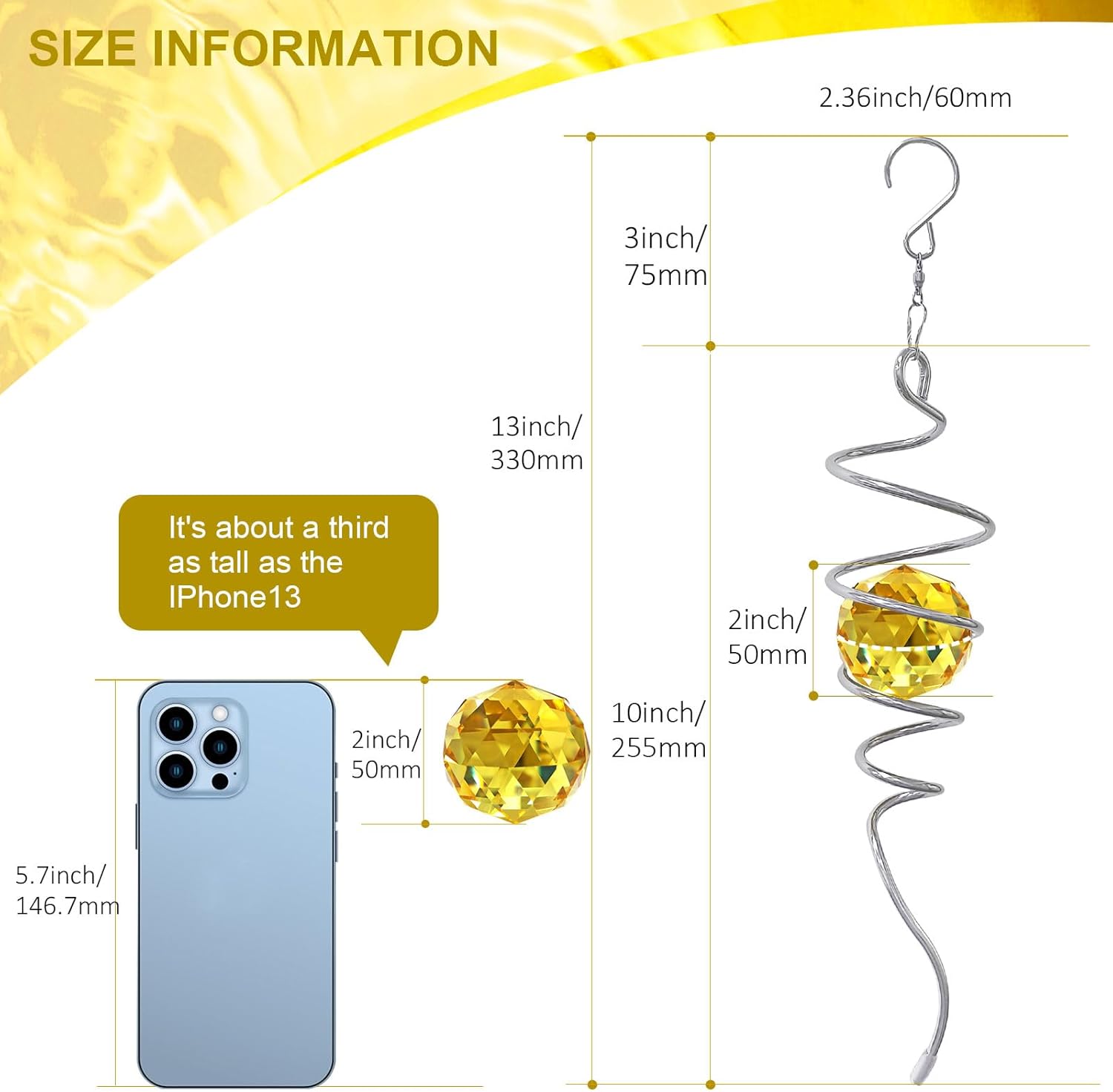 - 【 High Quality Gazing Ball Spiral Tail 】Eiryhope's 13 inch height stainless steel gazing ball spiral tail is made of high quality stainless steel spiral wire and top crystal material, with an 11 inch spiral tail and a 2 inch solid K9 crystal glass ball. Finely crafted, the crystal balls are highly clear and cast stunning rainbows that transform sunlight into a beautiful array of colors. The fabulous crystal ball adds a touch of glamour to this crystal tail spinner.