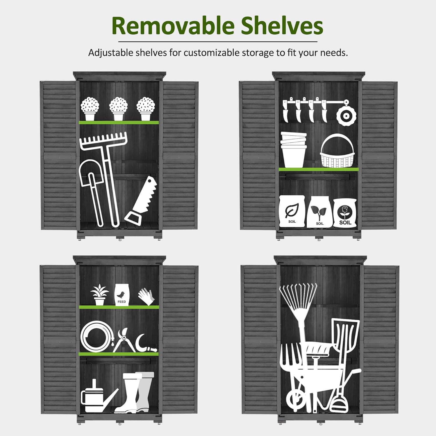 - 2 Removable Shelves: The shelves of the outdoor cabinet storage can be easily taken out, and 4 different storage spaces are constructed to store your various garden tools, feed, pool chemicals and equipments, etc.