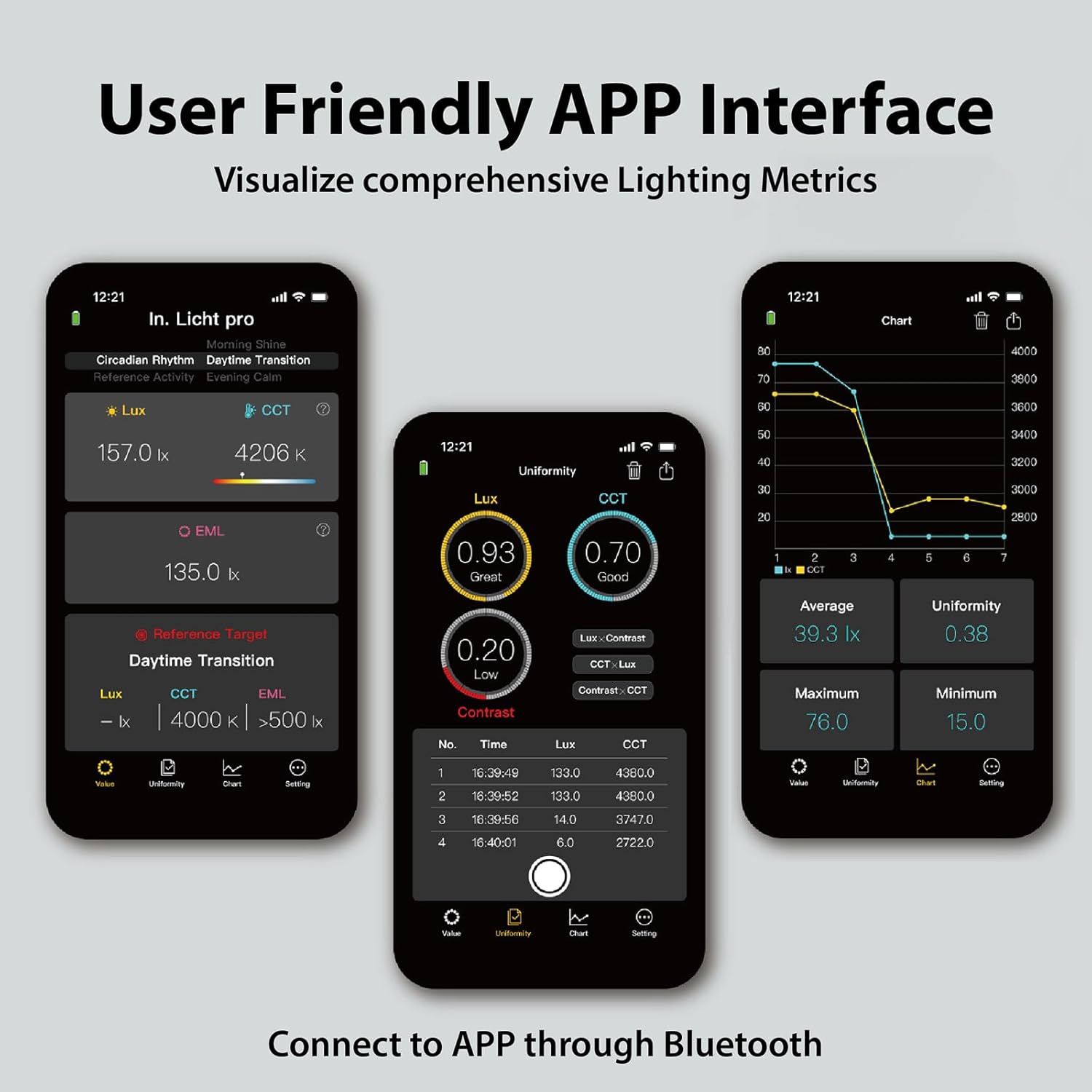 - [Smart Connectivity] Compatible with iOS and Android devices. Please scan the QR code on the back of the product and download the In. Licht pro-Lighting Meter app. Then connect the app via Bluetooth to transfer data analysis to your phone.