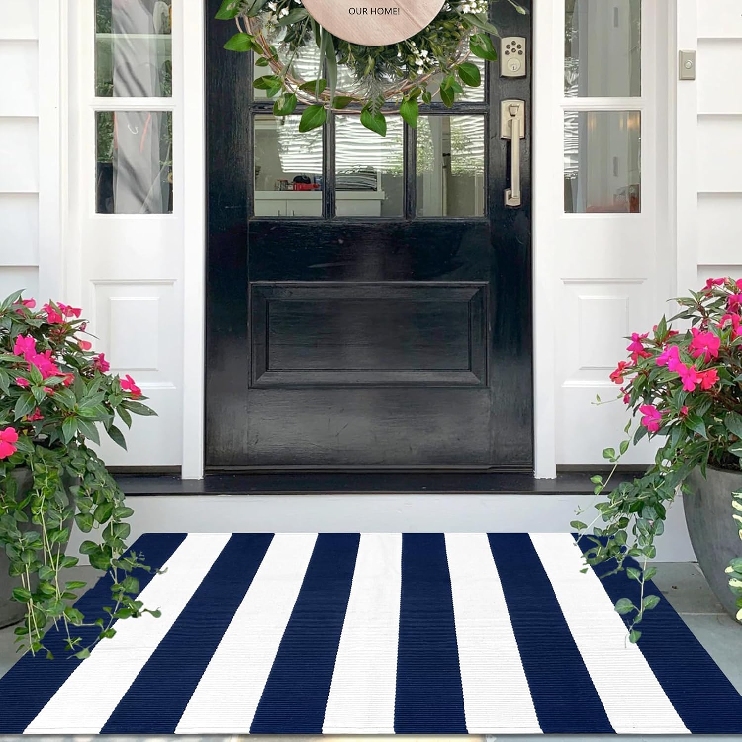 - Easy to Clean: This navy and white striped rug is simple to maintain with machine wash or vacuuming to remove dirt. The rug is sturdy and can be tumble dried on low. Keep your door rug fresh and clean with minimal effort. NOTE: Cotton rugs normally shrink slightly after washing