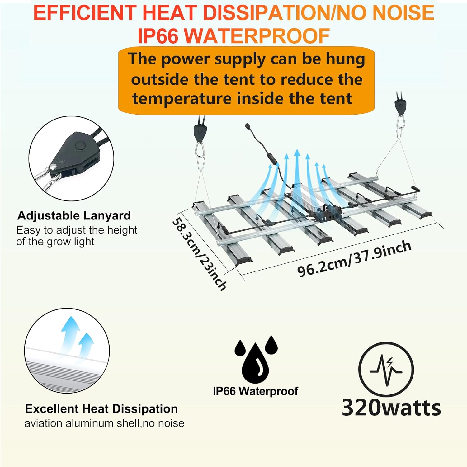 - 【Max Coverage Area Plant Lamp Full Spectrum】320W Full spectrum (380-410 nm, 660-665nm, 730nm,3200-4200K,4800-5000K) is perfect for veg to grow,6 LED grow lights bars , it can provide evenly distributed light intensity.It can coverage for 4x4ft of high-yielding full-cycle growth.
