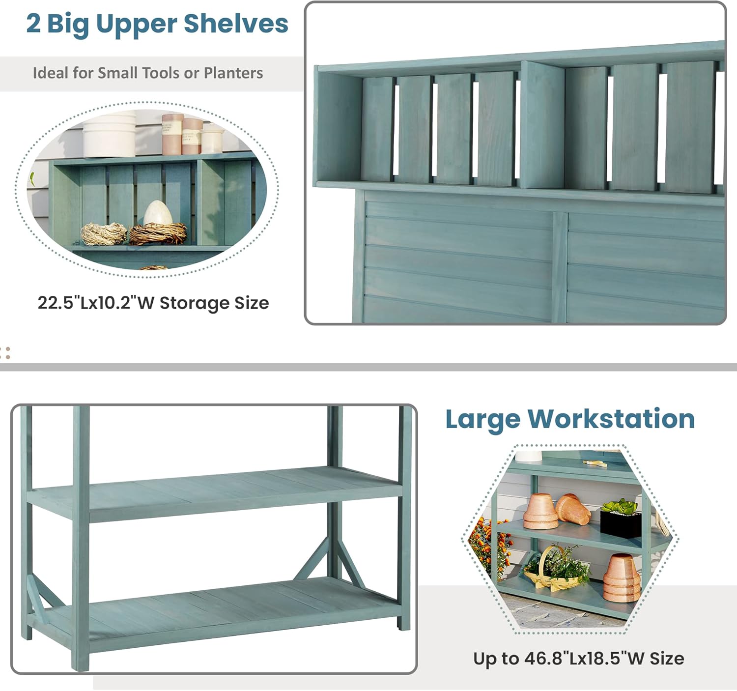 - Spacious Workstation: Who's ready for Spring? Get a little bit of inspiration for the coming season from this farmhouse garden potting bench. Made of 100% fir wood, this table is sturdy enough for outdoor use with its 46.8x18.5 inch workstation. Compared with another potting benches, its surface is spacious for putting many tools or planters from your loved garden.
