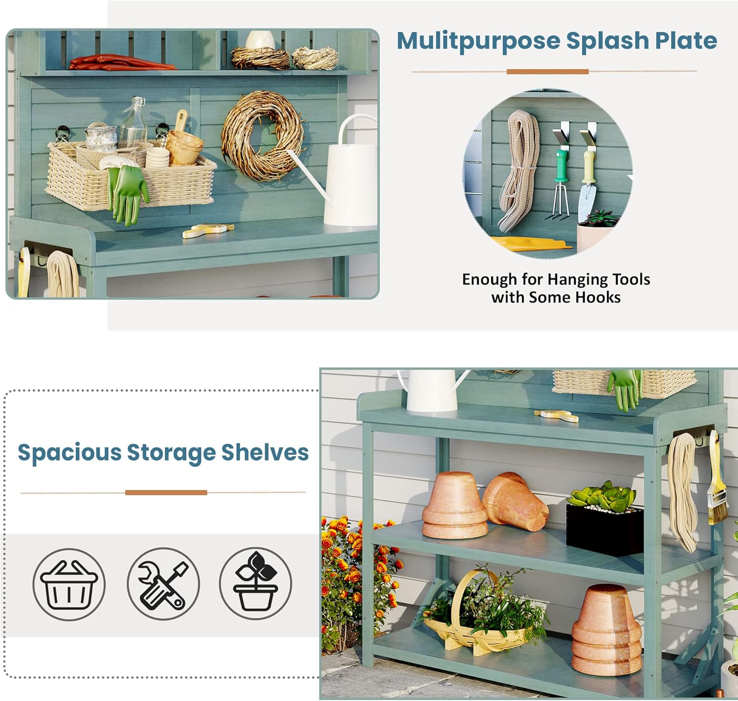 - Splash Plate& Side Hook: There are always many small kits when gardening such as hand trowels, rakes, transplanters, towels, gloves, and, of course, your farmer's hats. Just with some nails, the splash plate will become a board to hold your tools. Besides, the potting table comes with 3 hooks on the side which will make gardening easier.