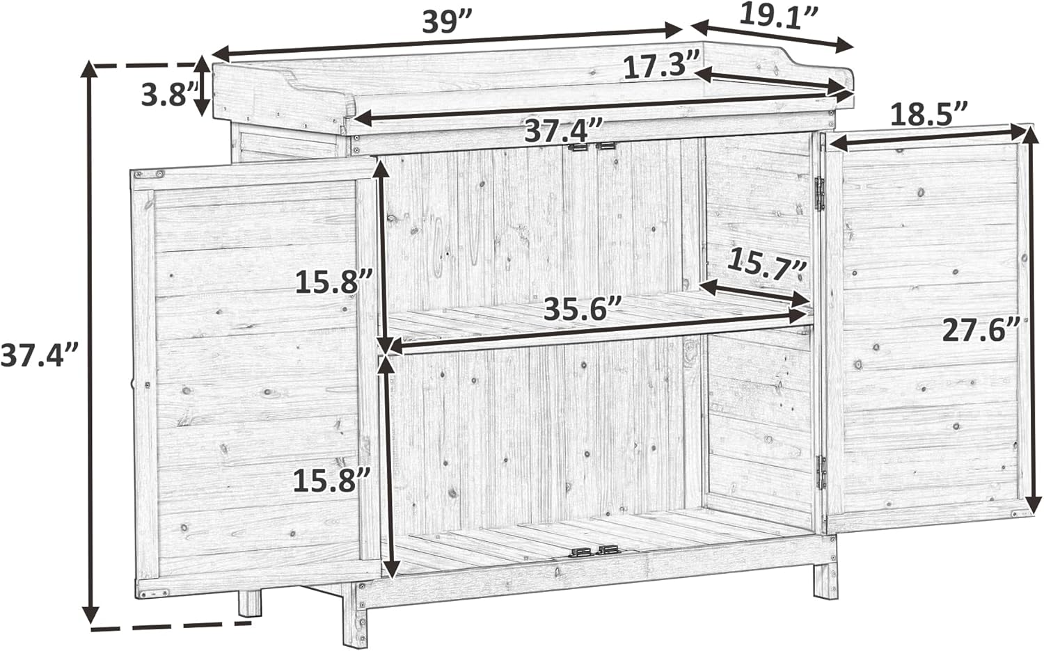 - Ample 2-Tier Storage Cabinet: If you are a big fan of gardening, this potting bench will be a great choice. With a 37.4" total height, 2 ample storage shelves are designed to keep your tools handy and in one place without bending over or squatting. Constructed with a removable shelf, this potting table is ample enough for not only small tools but also extra soil, pots, and other gardening supplies.