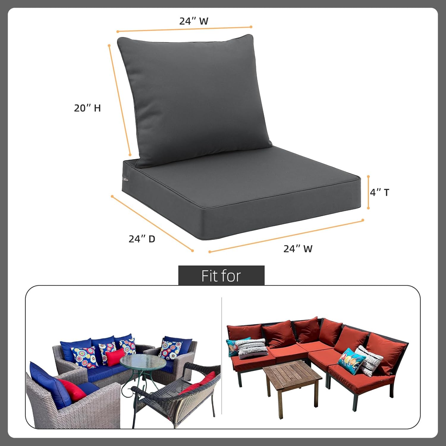 - Size Selection - Set includes 1 seat cushion measuring 24” W x 24” D x 4” T and 1 back cushion measuring 24” W x 20” H. ( The size description is only for the cushion size, accurately measuring the dimensions of your furniture's seating area in advance, make sure the cushion size fits your furniture ).