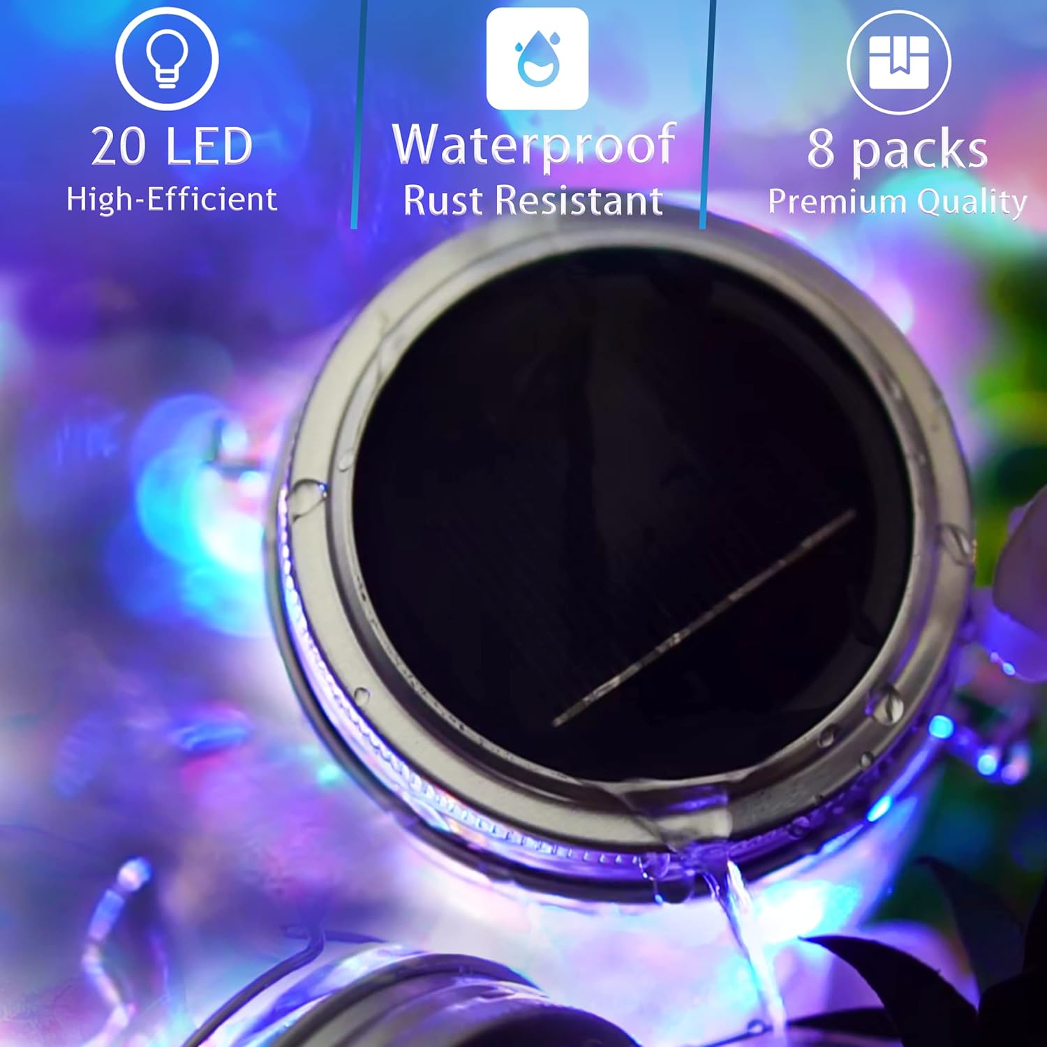 SunKite Solar Mason Jar Lights [Updated], 8 Pack 20 LED Waterproof Fairy Firefly Jar Lids String Lights with Hangers(NO Jars), Patio Yard Garden Wedding Decoration(Multi-Colored)