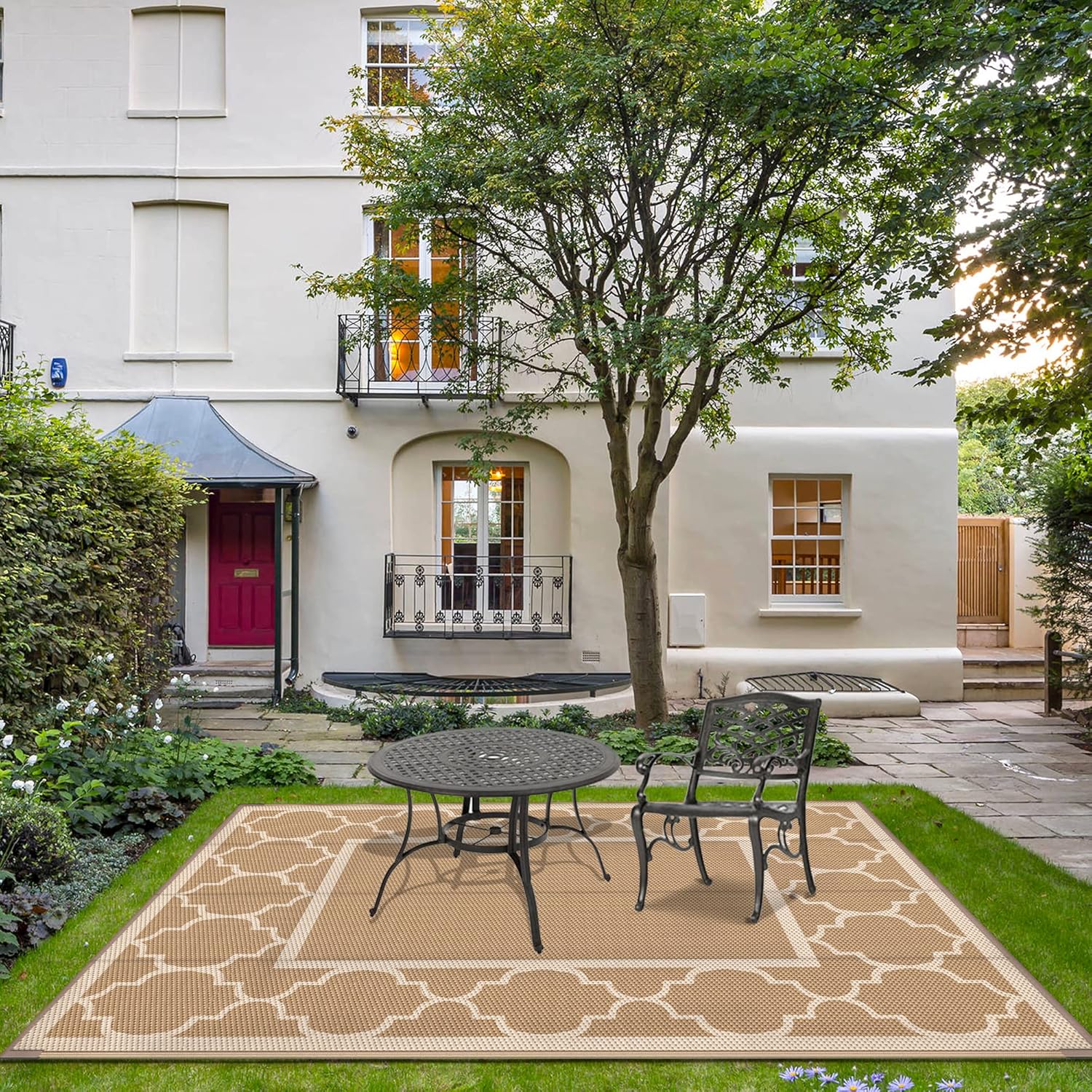 GENIMO 6' x 9' Outdoor Rug Waterproof for Patio Decor, Foldable Reversible Plastic Straw Area Rugs Mat for Camper, Outside Carpet for Rv, Deck, Porch, Picnic, Beach, Balcony, Brown & Beige