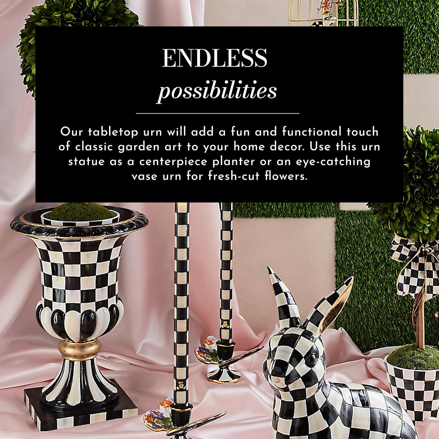 - DECORATIVE PEDESTAL VASE: Create the perfect centerpiece or elegant accent with this pedestal planter. It features our signature Sterling Check pattern with hand-painted gray-and-white checks and golden embellishments.