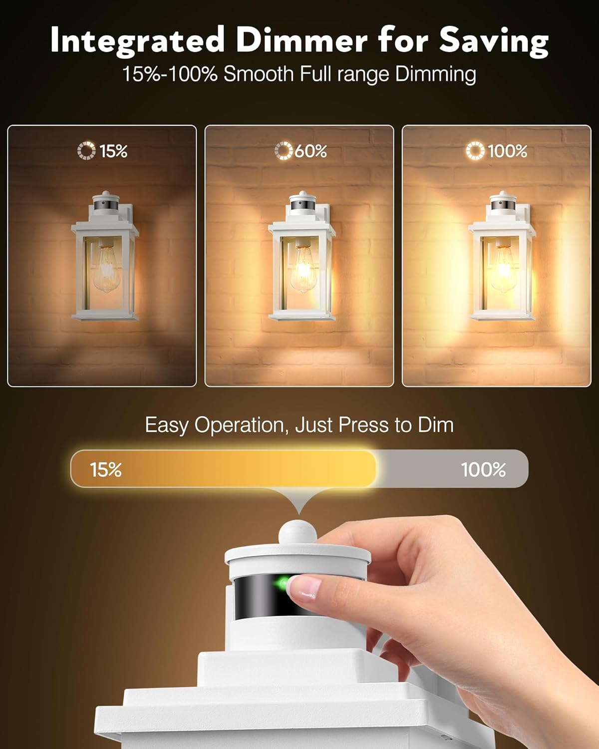 - Mode one-key switch: Introducing our carriage lantern switch modes with just one touch! With a quick press of sensor button, you can switch between DIM and ECO modes and D2D mode. Red light is DIM mode, green light is ECO mode. No special tools are required - it's easy! In addition, our porch lights are equipped with a dimmable function, which allows you to adjust the brightness between 10% and 50% during standby. By using this function, you can enjoy significant energy-saving effects.