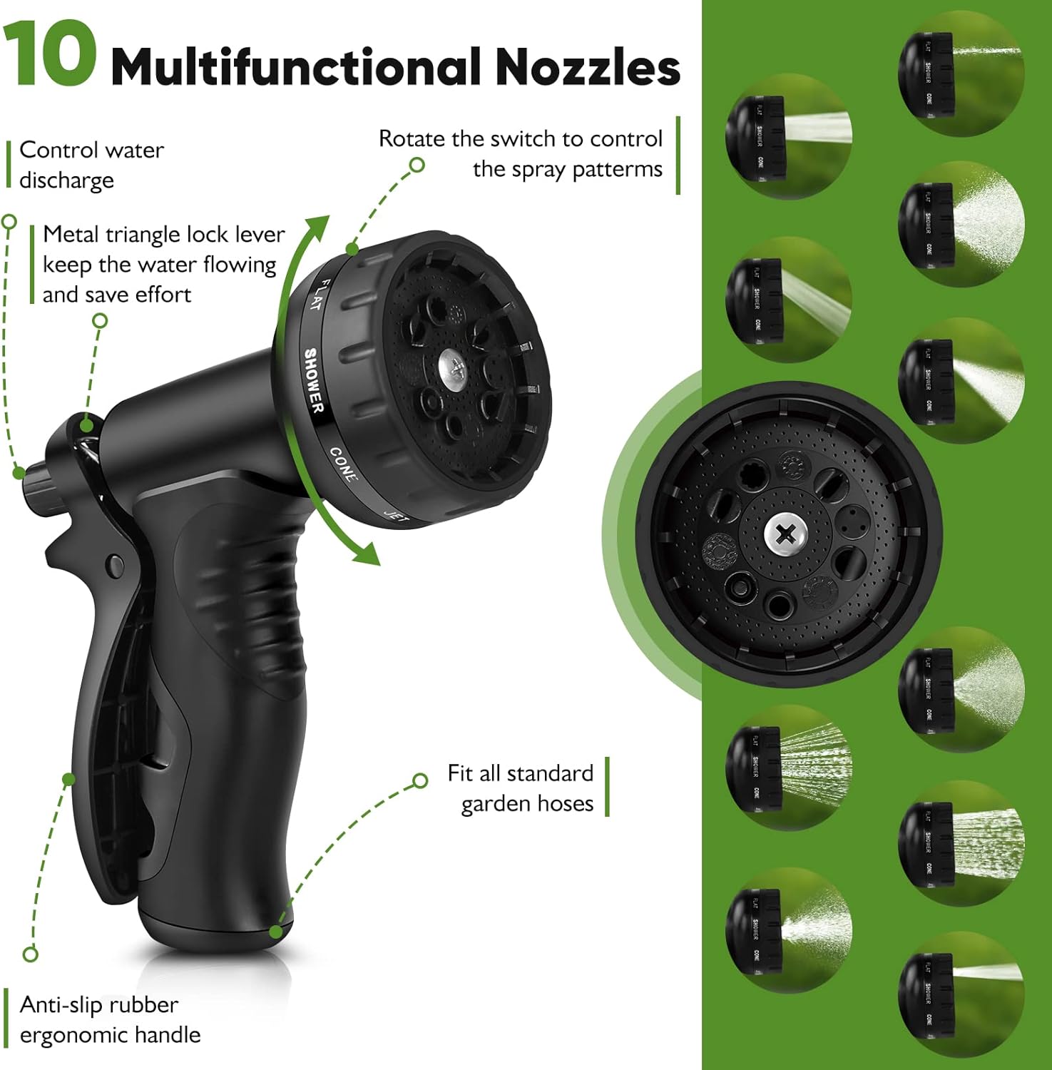- The metal water hose nozzle is made of metal zinc alloy and ABS plastic for greater durability and corrosion resistance. The thumb control makes this nozzle easy to hold and switch. In addition, the ergonomically designed nozzle grip features a non-slip rubber pad that is more comfortable to use and prevents slippage. The rotating baffle allows you to choose from 10 spray patterns to meet all your needs. Can be used for watering gardens and cleaning houses, cars, yards, pet bathrooms, and so on.
