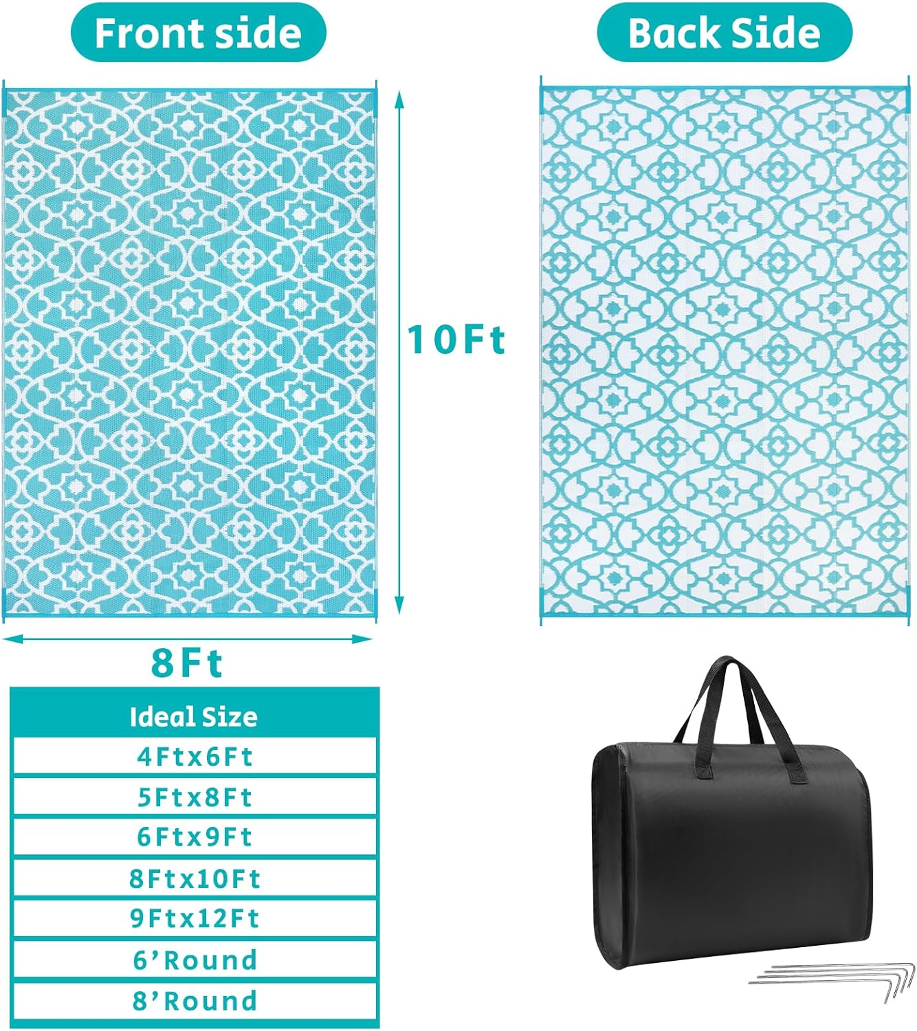 • XXL Large Reversible Outdoor Rugs: Featuring a classic moroccan pattern on both sides, this rectangular 8x10 ft outdoor area rug allows you to instantly refresh your patio, porch, backyard, deck, RV campsite. And this outdoor deck rug is reversible, two-sided design allows you to have two different looks,both sides can blend perfectly with nature and look very full and comfortable.