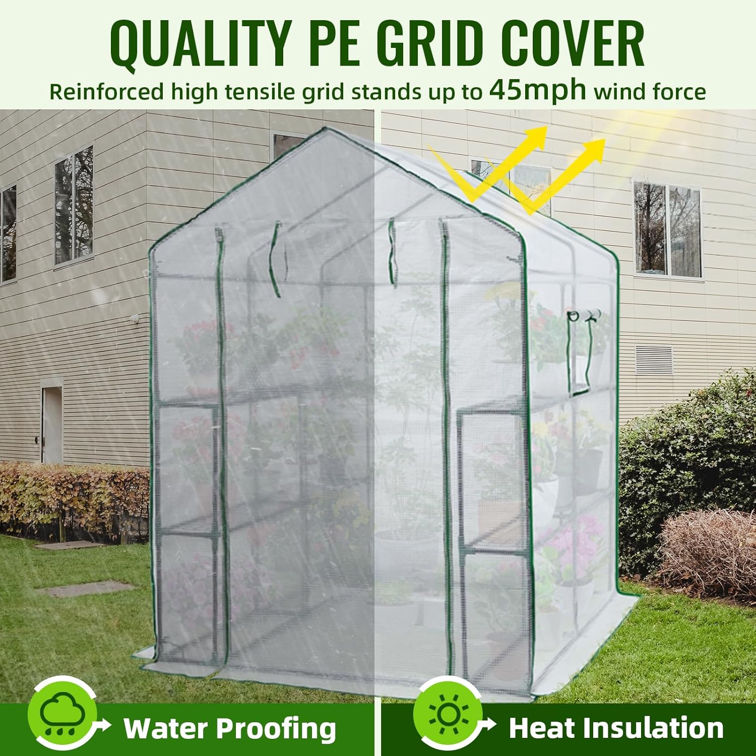 - Thick & Durable PE Cover: Engineered with a high-tensile grid and double-stranded edge banding, our walk-in greenhouse is designed to withstand winds of up to 45 mph, effectively protecting your plants from harsh weather conditions. This cover not only provides exceptional waterproof protection but also reduces harmful UV exposure, allowing your plants to thrive under optimal natural light conditions