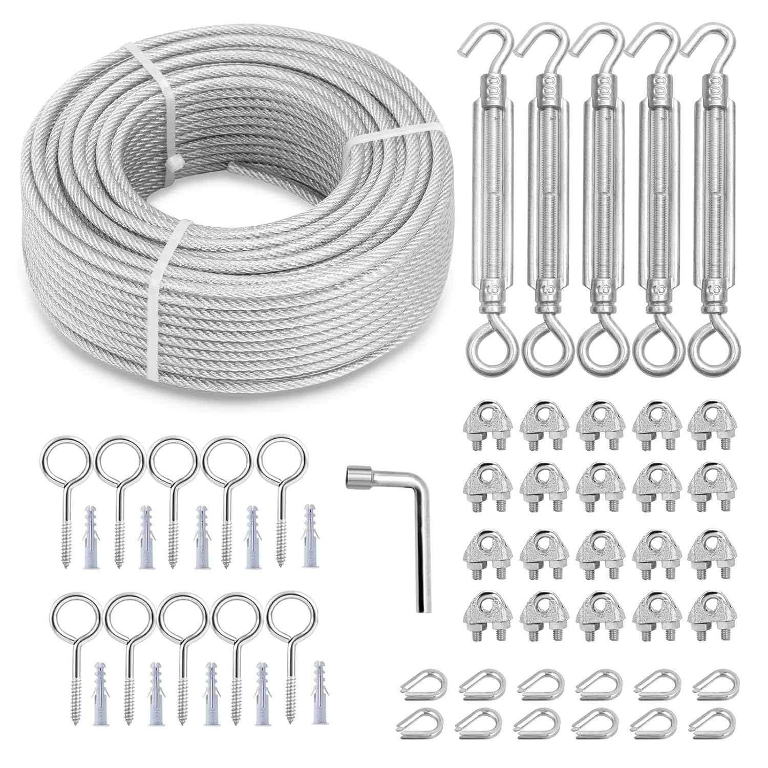 - Recommended Uses For Product : WIRE KIT FOR VARIOUS PURPOSES INCLUDING STRING LIGHT HANGING, GARDEN TRELLIS, GRAPE WIRE SUPPORT, TENSION WIRE FOR CHAIN LINK FENCE, CLOTHESLINE, ANTENNA GUY WIRE, ESPALIER WIRE, OUTDOOR CABLE RAILING, AND SUN SHADE SAIL WIRE KIT FOR VARIOUS PURPOSES INCLUDING STRING LIGHT HANGING, GARDEN TRELLIS, GRAPE WIRE SUPPORT, TENSION WIRE FOR CHAIN LINK FENCE, CLOTHESLINE, ANTENNA GUY WIRE, ESPA… See more