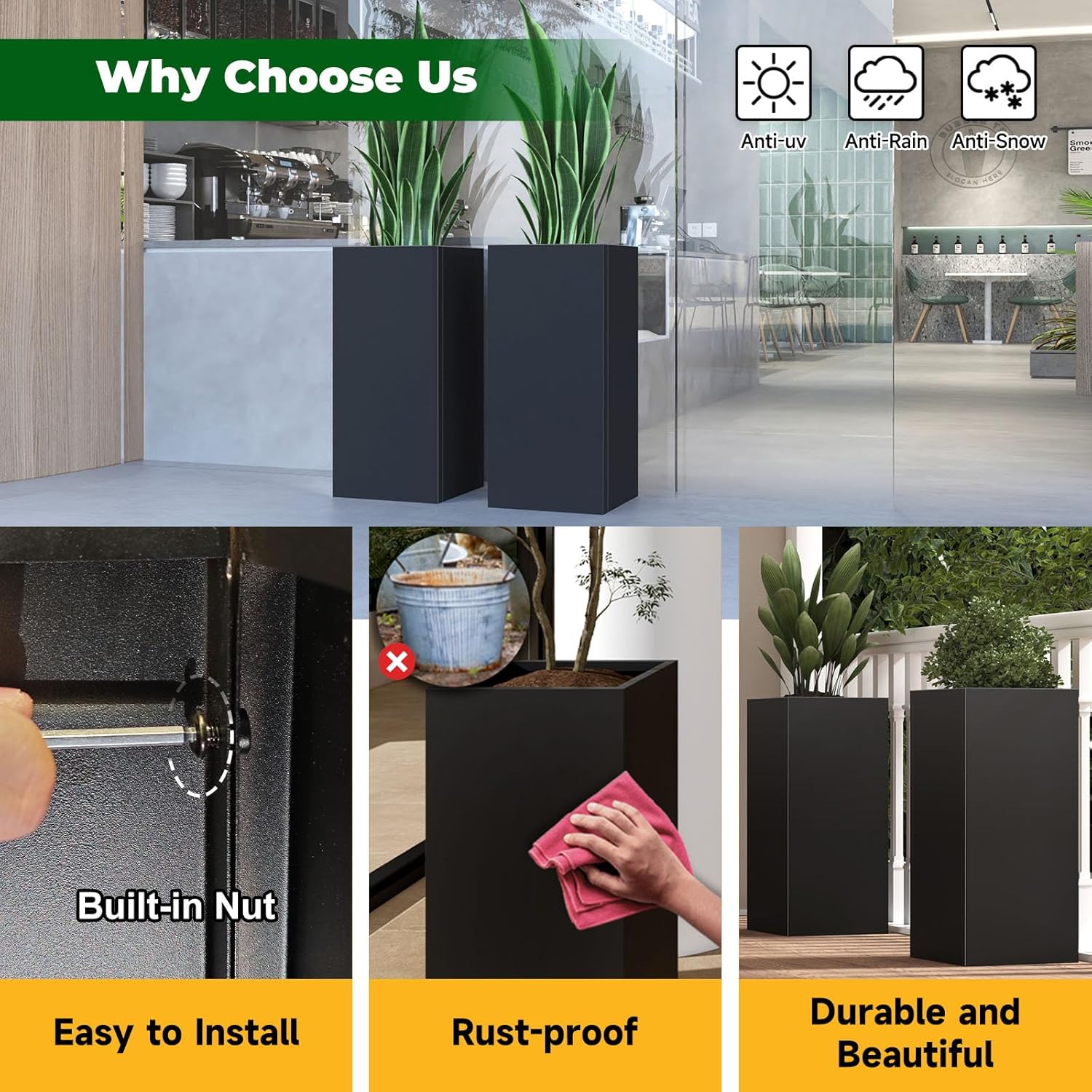 - WIDELY APPLICABLE - The black sleek metallic finish adds a touch of modern sophistication to any space, whether it's your garden, patio or living room.This tall rectangular flowerpot serves as a beautiful accent.