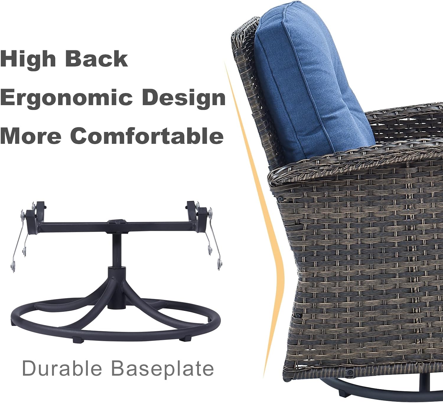 - Swivel Rocking Chairs:Resting on chairs with sturdy round metal base allows to glide gently and swivel 360° for relaxing, with seat and back cushions contribute to comfortable support, making the outdoor set a perfect addition to transform your patio.
