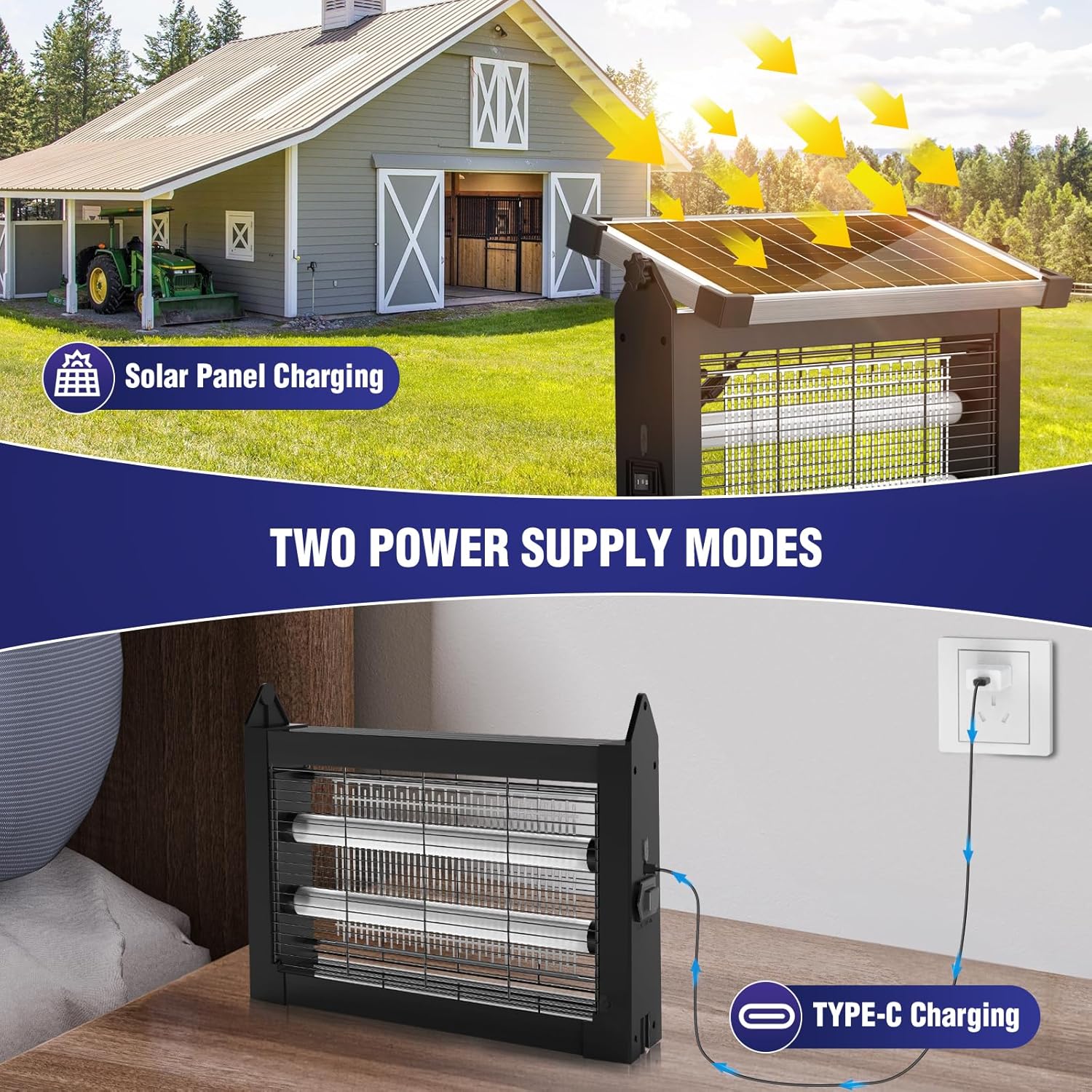 - Multiple Operating Modes for Convenience: Mosquito zapper features various operating modes, including automatic, manual, and off. In manual mode, the solar panel charges the battery in sunlight. In automatic mode, the fly traps device only charges in sunlight and the insect-killing light automatically turns off, to auto turn on again at night (ensure the solar panel is properly connected for charging). For optimal mosquito-killing effectiveness, minimize surrounding light during use.