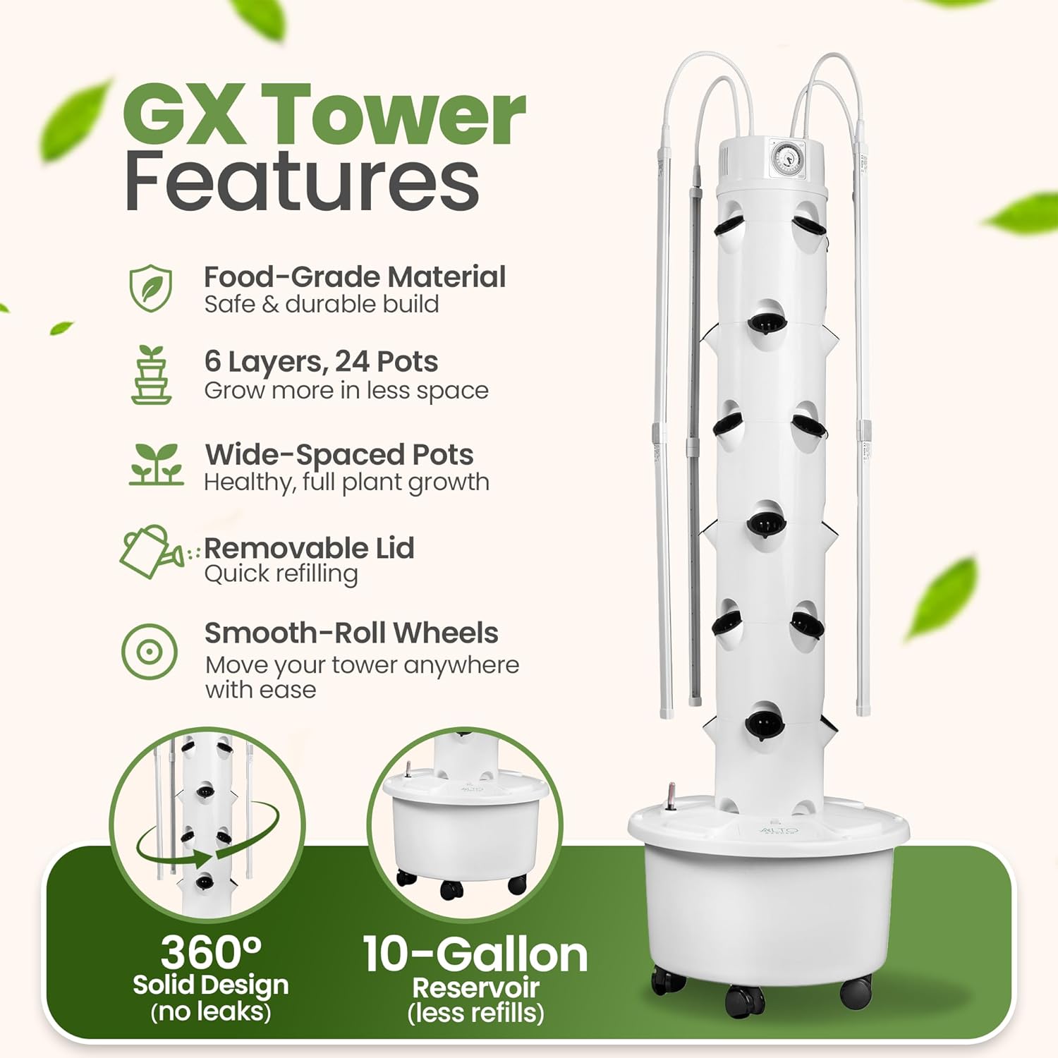 GX Hydroponic Tower | Vertical Planter Tower | Hydroponics Growing System Kit | Food Grade with 24 Net Pots (with LED Grow Lights)