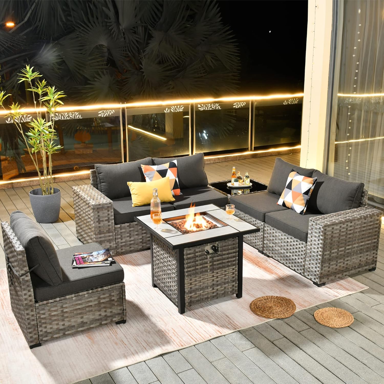 HOOOWOOO Modular Patio Outdoor Sectional Furniture Set with Gas Propane Fire Pit Table,7 Piece Wicker Conversation Sofa Set,Out Door Couch Set with Wide Arm Outside(Black)