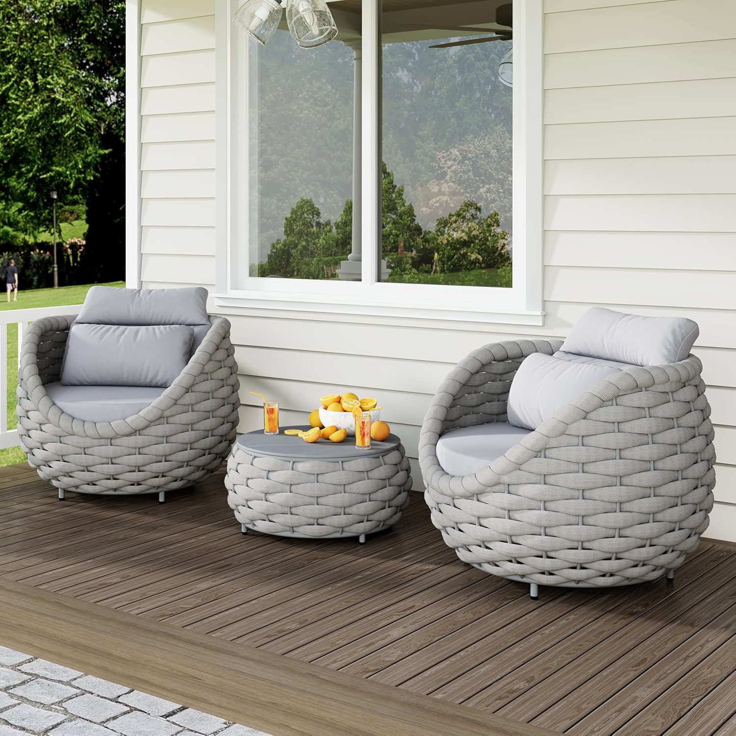 Front Porch Furniture Set: 3 Pieces Aluminum Patio Conversation Sofa Set for 2 - All Weather Woven Rope Outdoor Armchair Set w/Cushions No Assembly for Bistro Pool Yard Balcony Deck Hotel, Gray