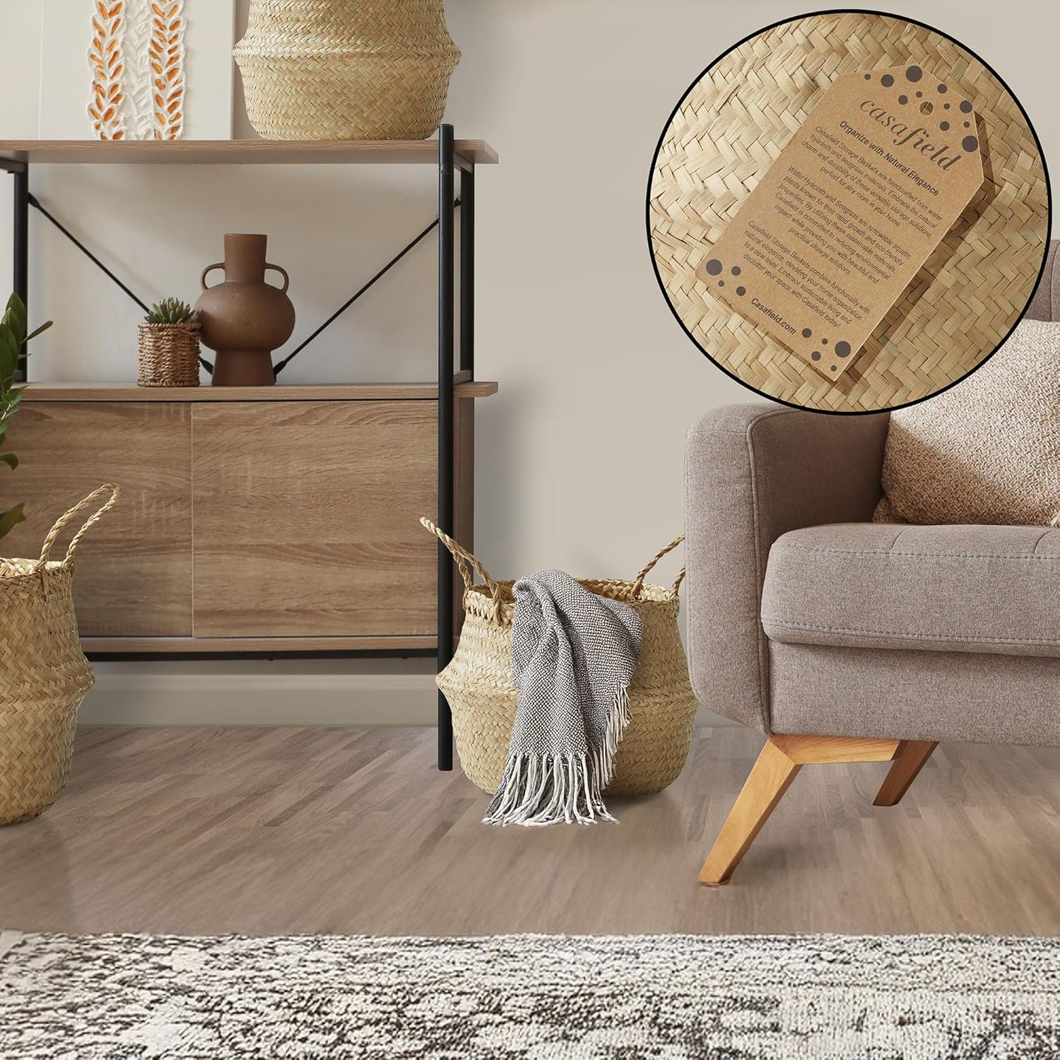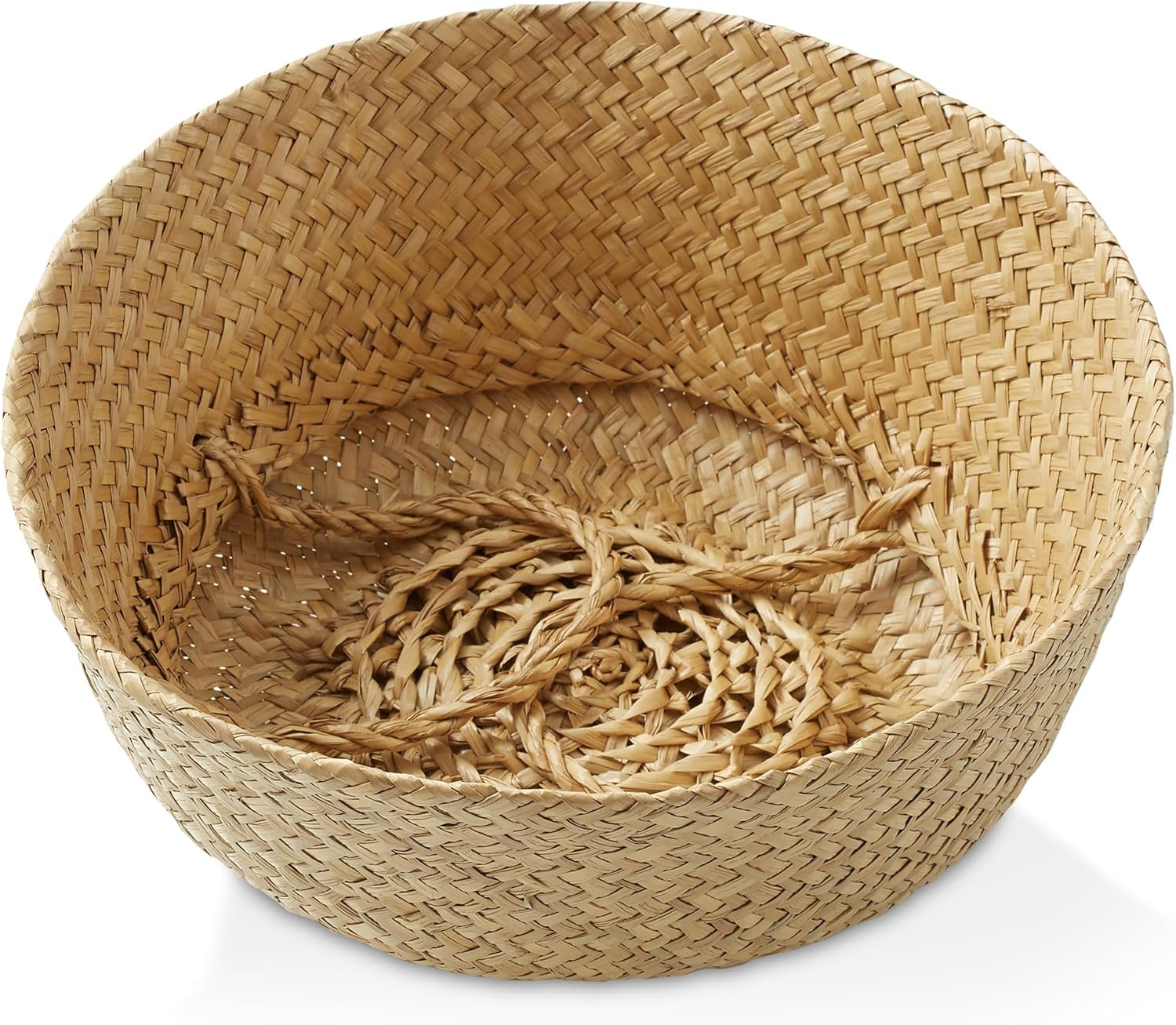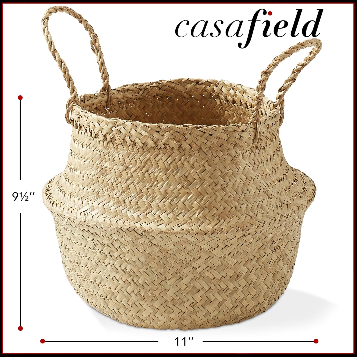 - Seagrass storage basket with handles: This handwoven seagrass belly basket is the perfect addition to any home. It offers ample storage for blankets, toys, or laundry and it can be used as a planter. It features a foldable design for effortless organization. Dimensions: Medium Basket - 11" Diameter x 9-1/2" High