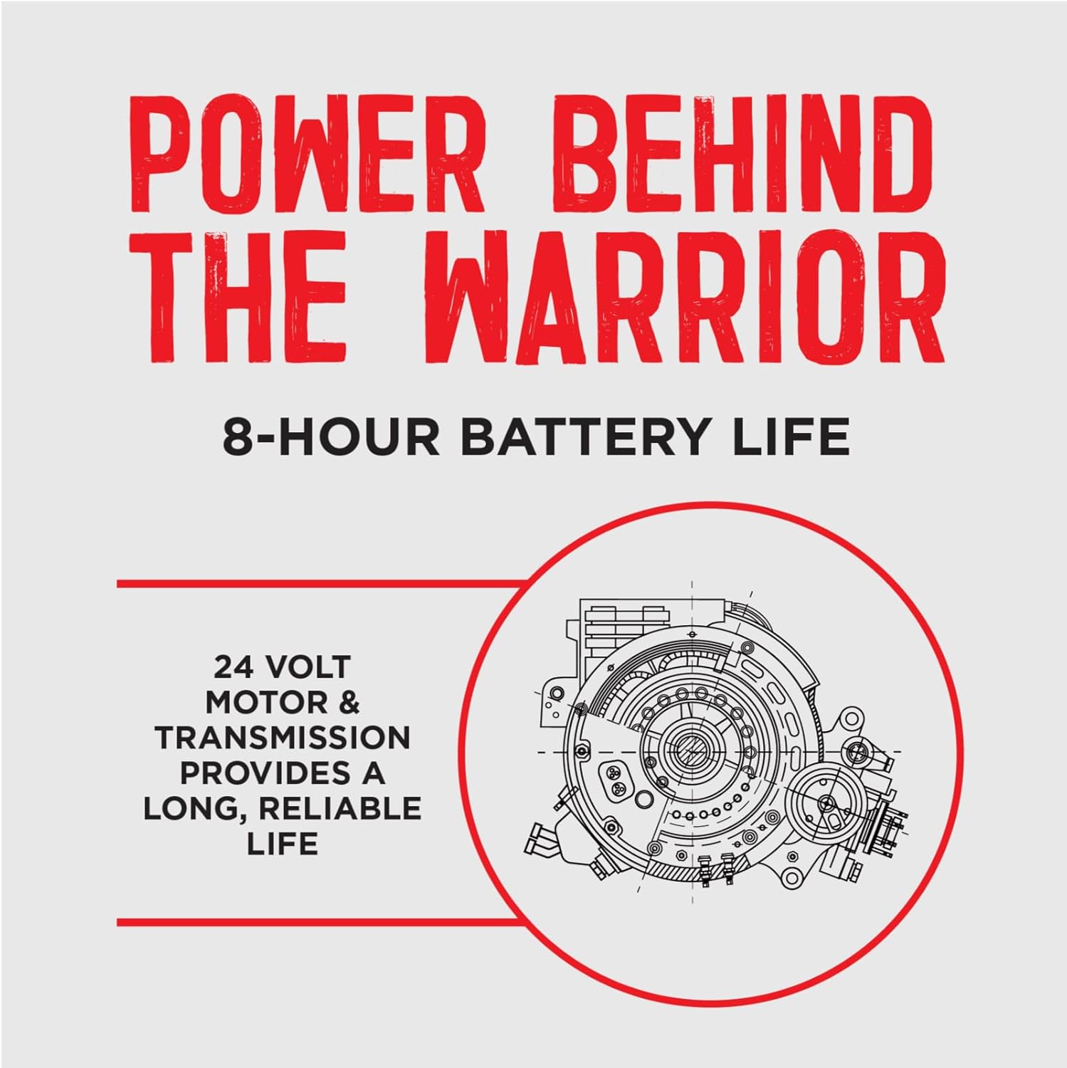 - Battery: Powerful, 24-volt rechargeable battery-operated drive system. Comes with an illuminated battery power level indicator. Use a standard 120v AC outlet to charge. 2 sealed Acid Glass Mat 9Ah batteries.