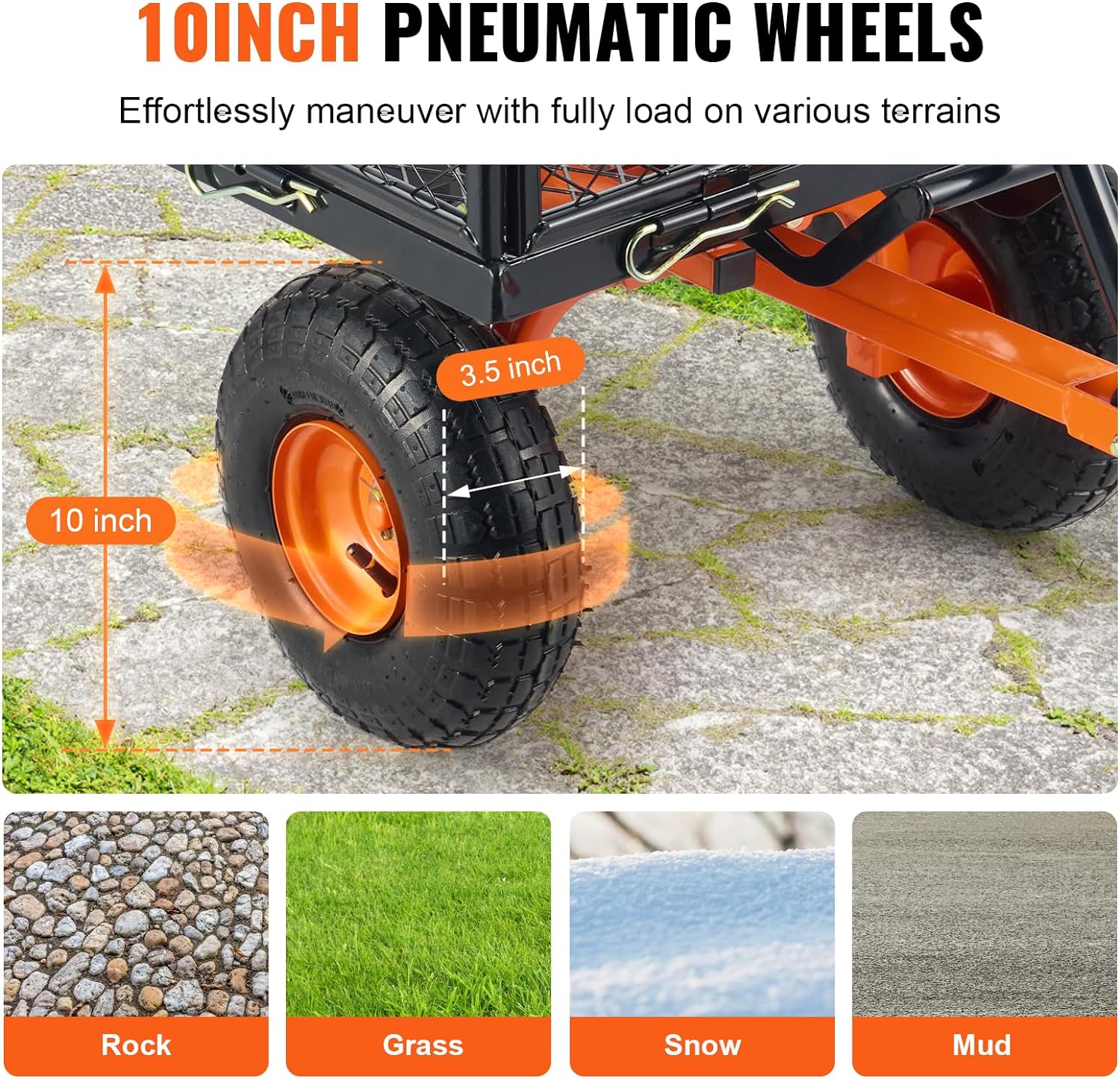 - Large Tire Size: With ΓΈ255mm/10" rubber tires, the yard cart provides excellent shock absorption, navigating uneven garden terrain or grassy slopes, ensuring smooth transport.