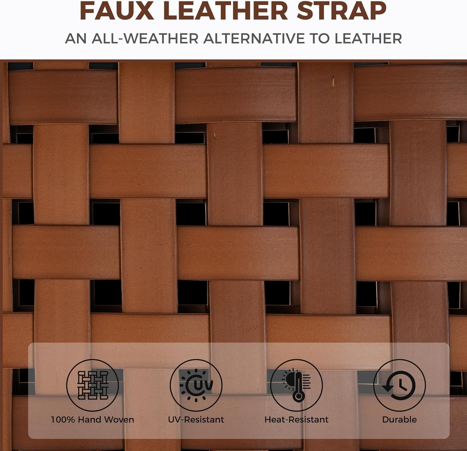 • LEATHER-LOOK:Bold and beautiful! Our handwoven wide strap faux leather is tested for year-round outdoor resilience with enduring beauty and strength, delivering a leather look without extra maintenance! Rated at 2000 UV hours, it is easy to clean and extremely resistant to the sun, rain, heat, and cold to not crack, sag, or fade. Due to lighting issues, the back of the chair may have a slight color difference