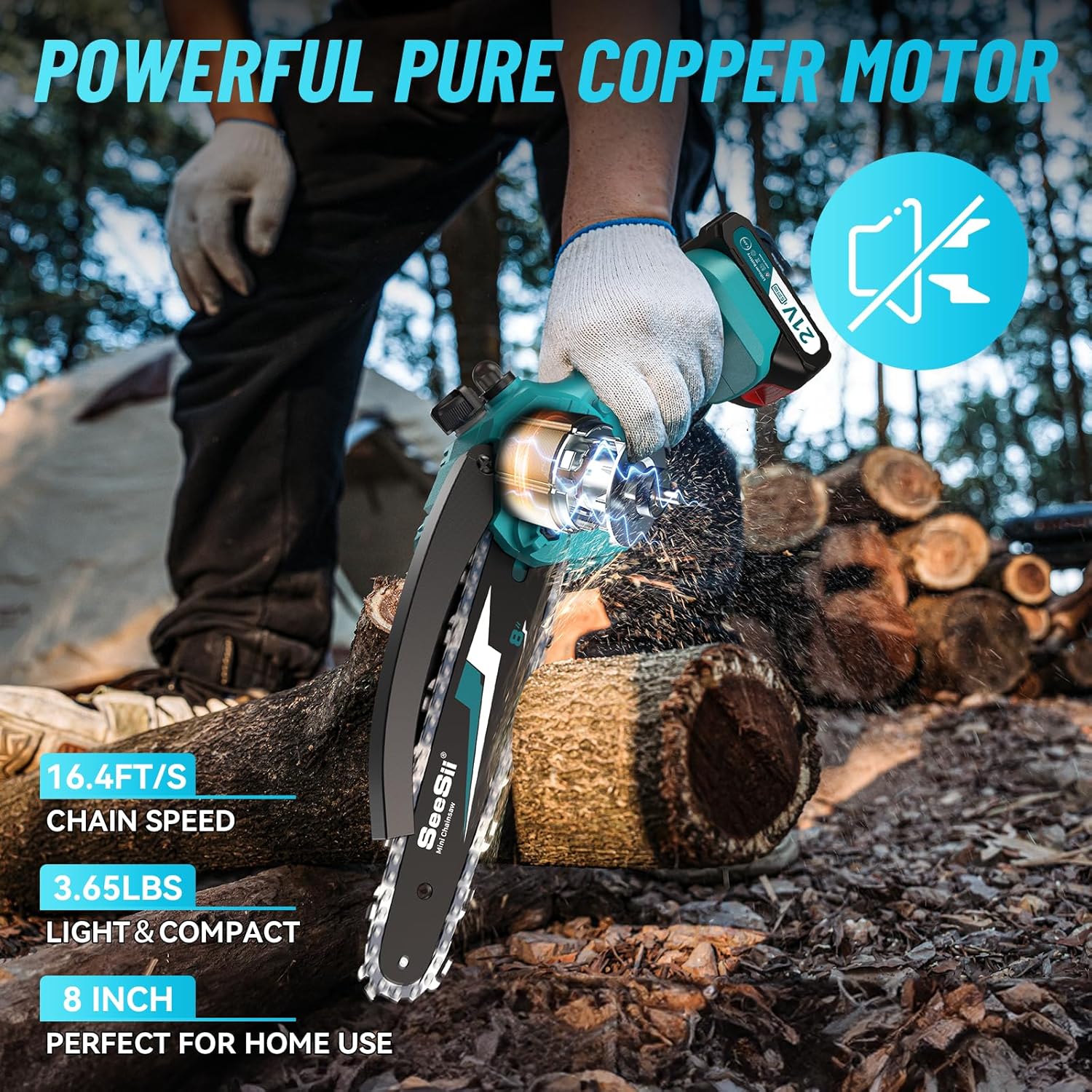 SEESII Mini Chainsaw 8 inch,Cordless Chainsaw w/ 2pcs 2000mAh Batteries,Oiler System & Replacement Chain,Handheld Chain Saw w/Safety Lock,Battery Powered Chain saw for Wood Tree Cutting,CH820+