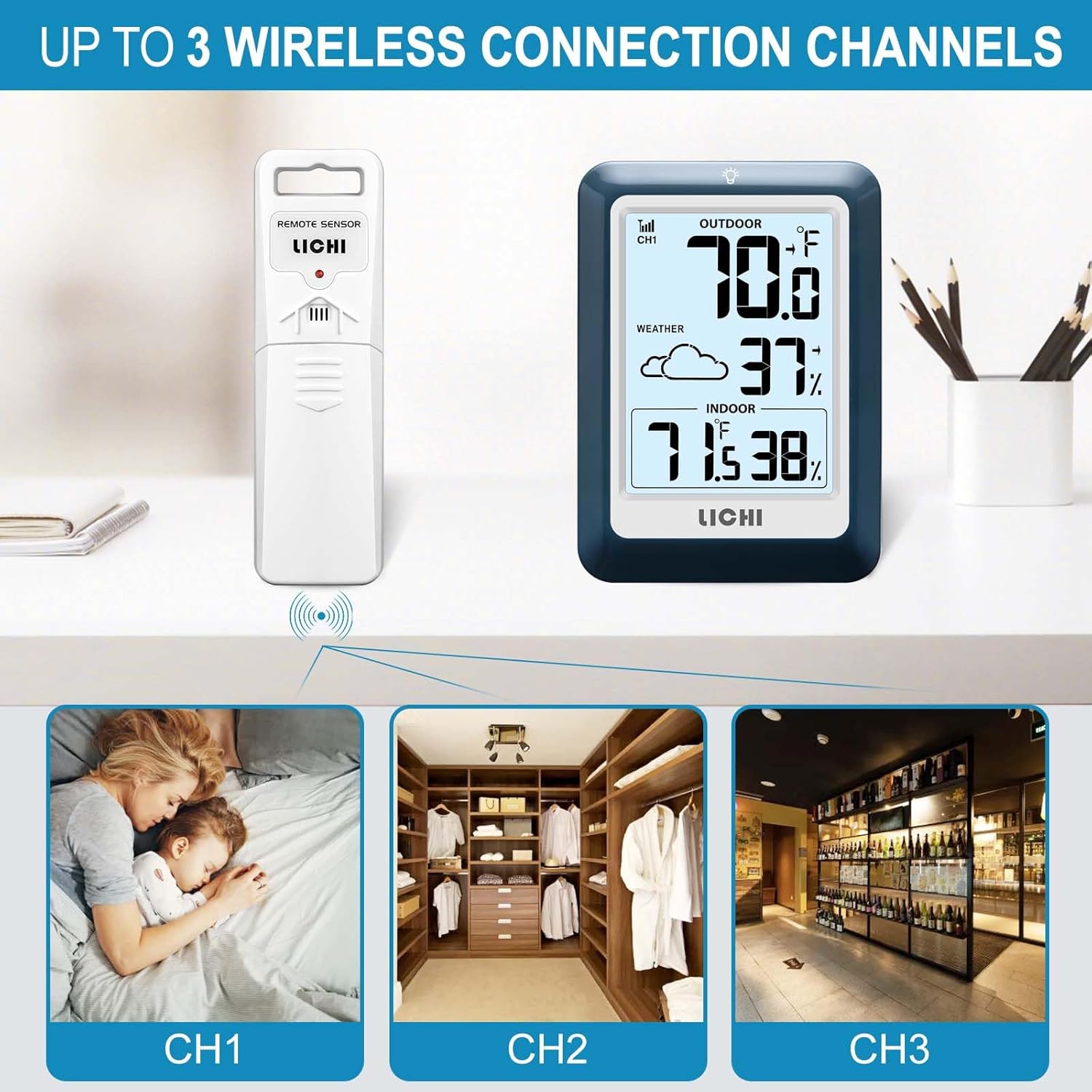 Indoor Outdoor Thermometer Wireless Weather Station, Internal External Thermometer Hygrometer, Home Batteryoperated Temperature Humiditymonitors330 Feet (About 100 Meters) Backlight Display (Blue)