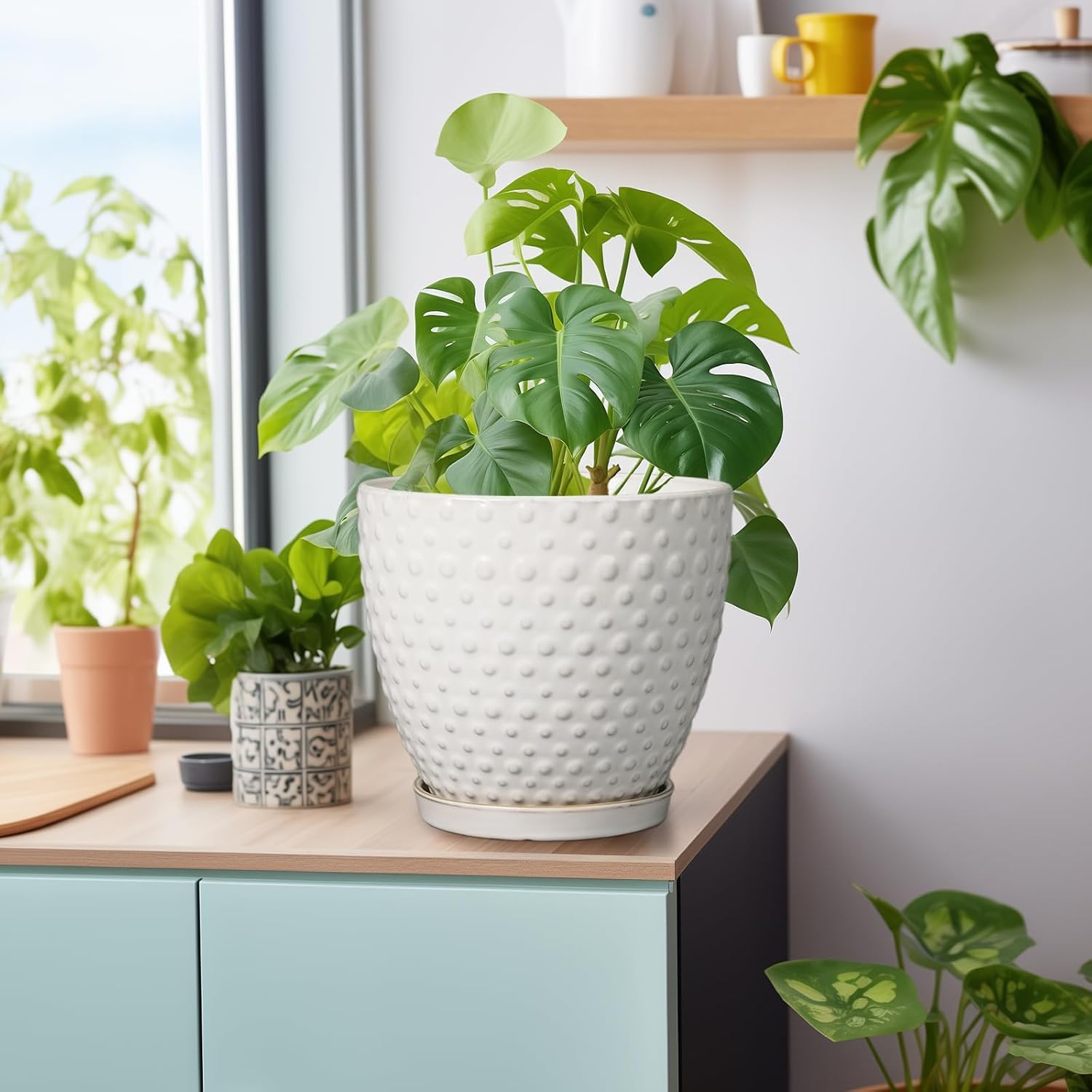 - Ideal Size: Each ceramic flower pot is 8.5 D x 7.5 H, which can provide enough space for your plants to thrive. One package includes white planter, ceramic tray and mesh