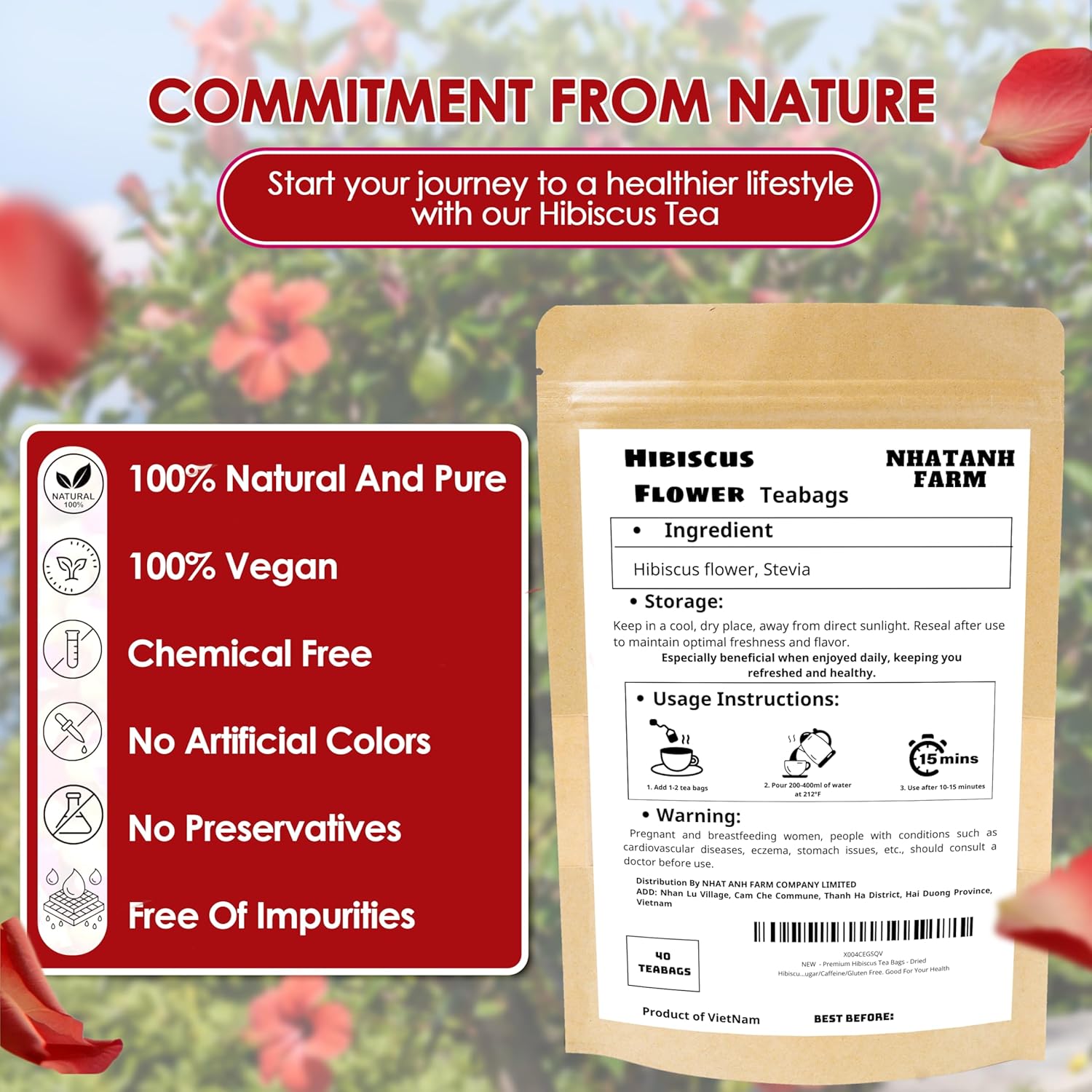 Premium Hibiscus Tea Bags - Dried Hibiscus Flower Tea Bags - 40 Teabags, 2.5g/bag), 100% Natural & Pure Hibiscus Flowers, Sugar/Caffeine/Gluten Free. Good For Your Health
