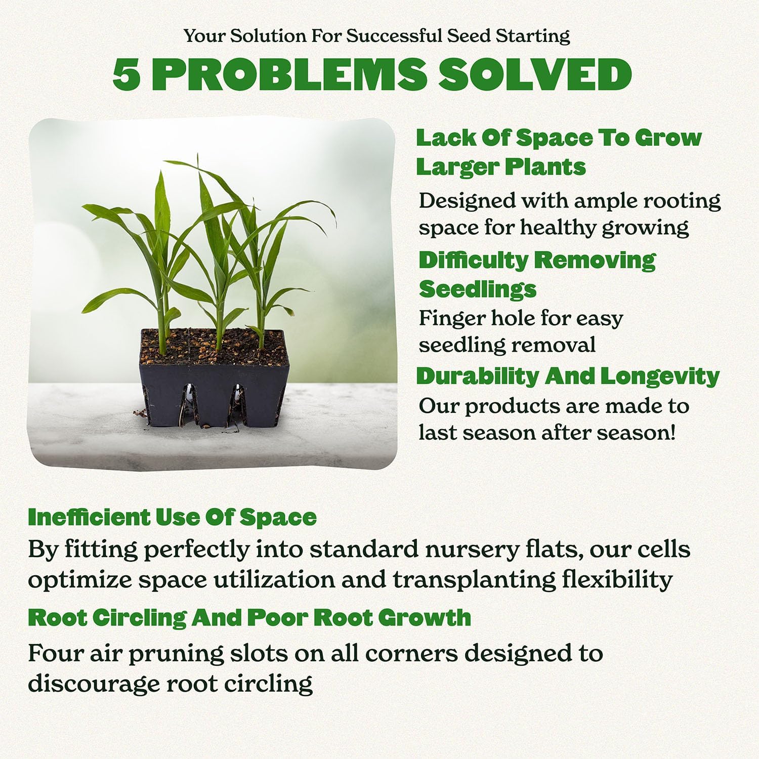 - No more crushed seedlings!: Forget the frustration of digging or using tools to remove seedlings. Our seedling starter trays feature large finger holes on each cell bottom. Simply push gently with your finger, and voila – your seedling pops out effortlessly, ready for transplanting.