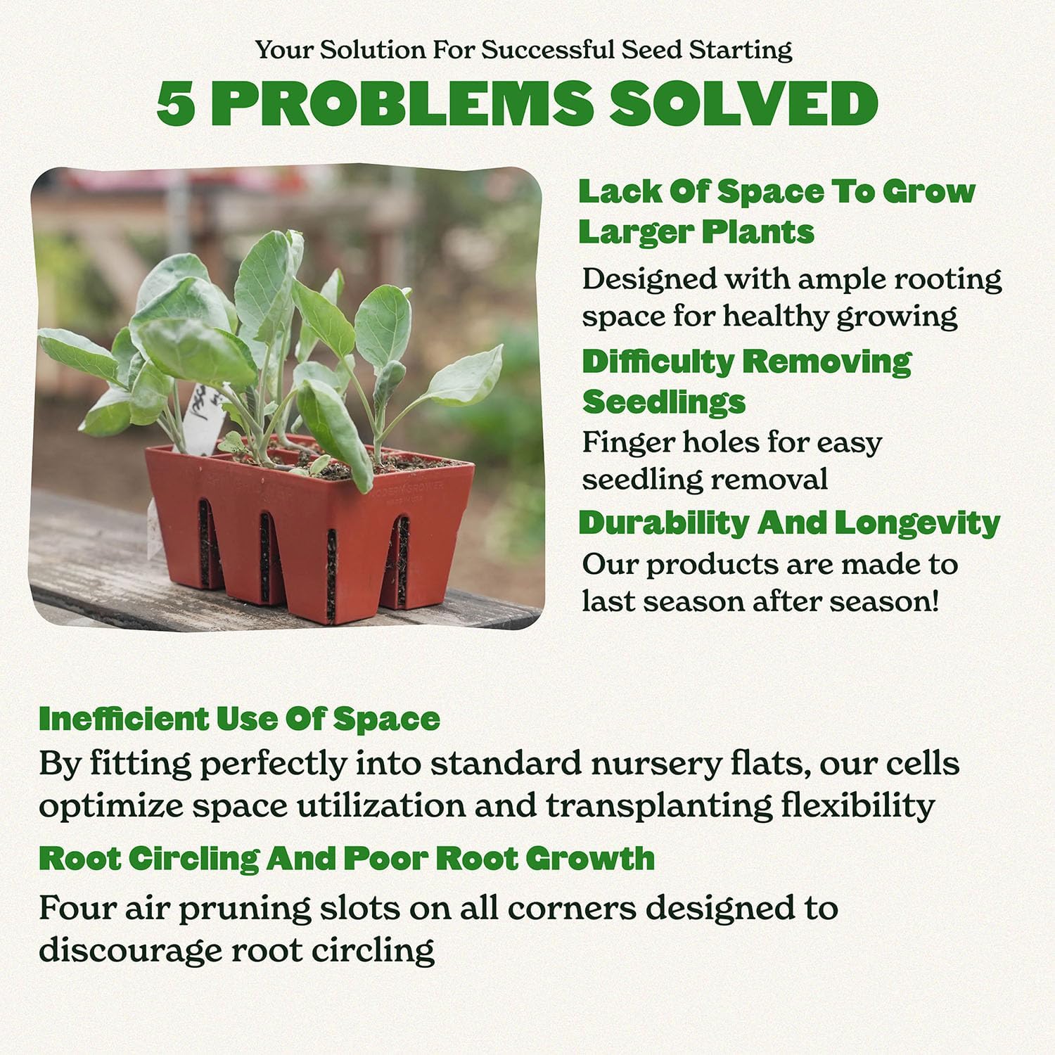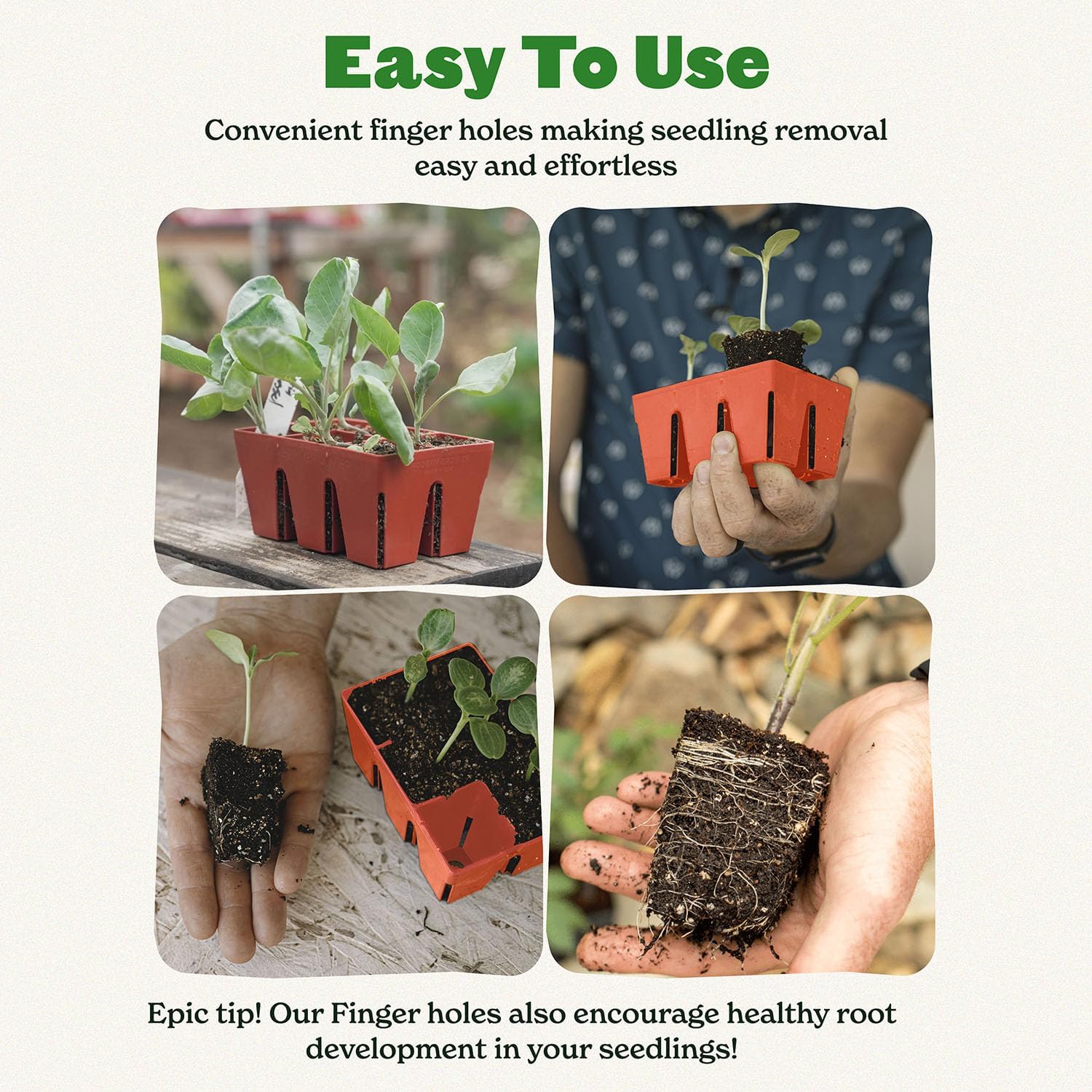 - No more crushed seedlings!: Forget the frustration of digging or using tools to remove seedlings. Our seedling starter trays feature large finger holes on each cell bottom. Simply push gently with your finger, and voila – your seedling pops out effortlessly, ready for transplanting.