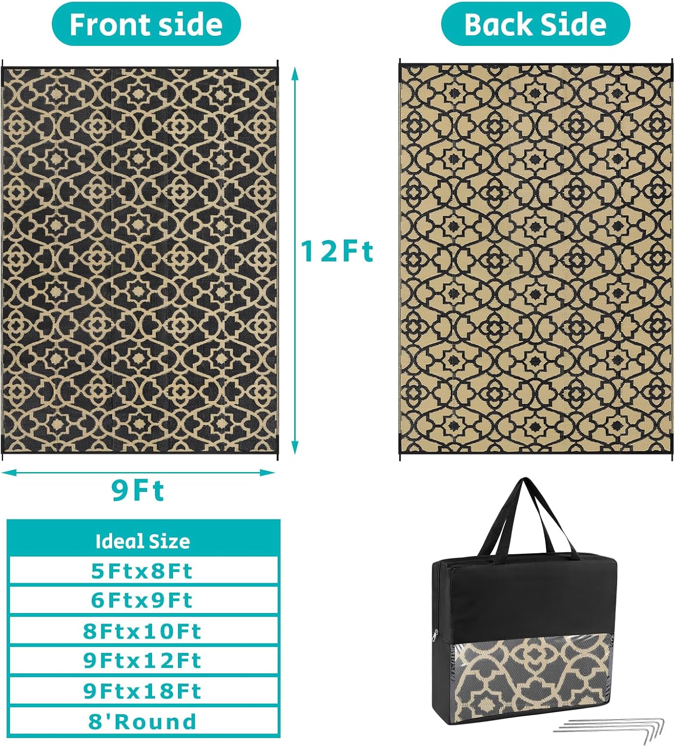 • XXXL Large Reversible Outdoor Rugs: Featuring a classic moroccan pattern on both sides, this rectangular 9x12 ft outdoor area rug allows you to instantly refresh your patio, porch, backyard, deck, RV campsite. And this outdoor deck rug is reversible, two-sided design allows you to have two different looks,both sides can blend perfectly with nature and look very full and comfortable.