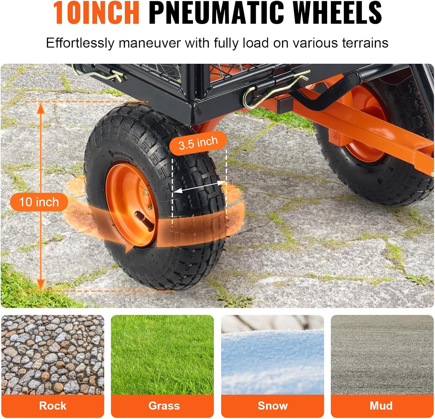 - Large Tire Size: With 10" rubber tires, the yard cart provides excellent shock absorption, navigating uneven garden terrain or grassy slopes, ensuring smooth transport.