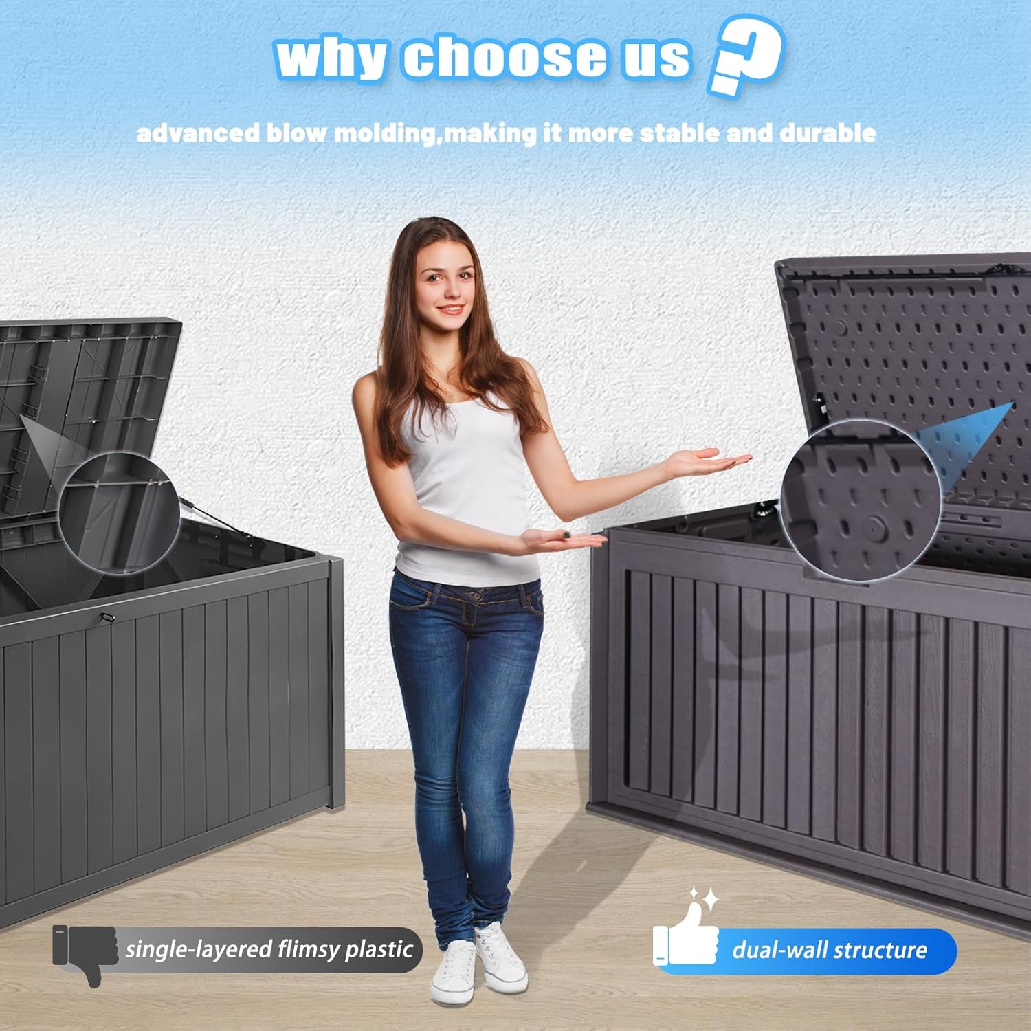 - THOUGHTFUL DESIGN: Featuring a humanized double air rod design, this deck box offers easy lifting and slow closing, enhancing convenience and safety. Equipped with a lock to prevent loss of items, it ensures secure storage for your belongings. Its understated yet timeless design effortlessly complements any decor, adding a touch of sophistication to any outdoor space.
