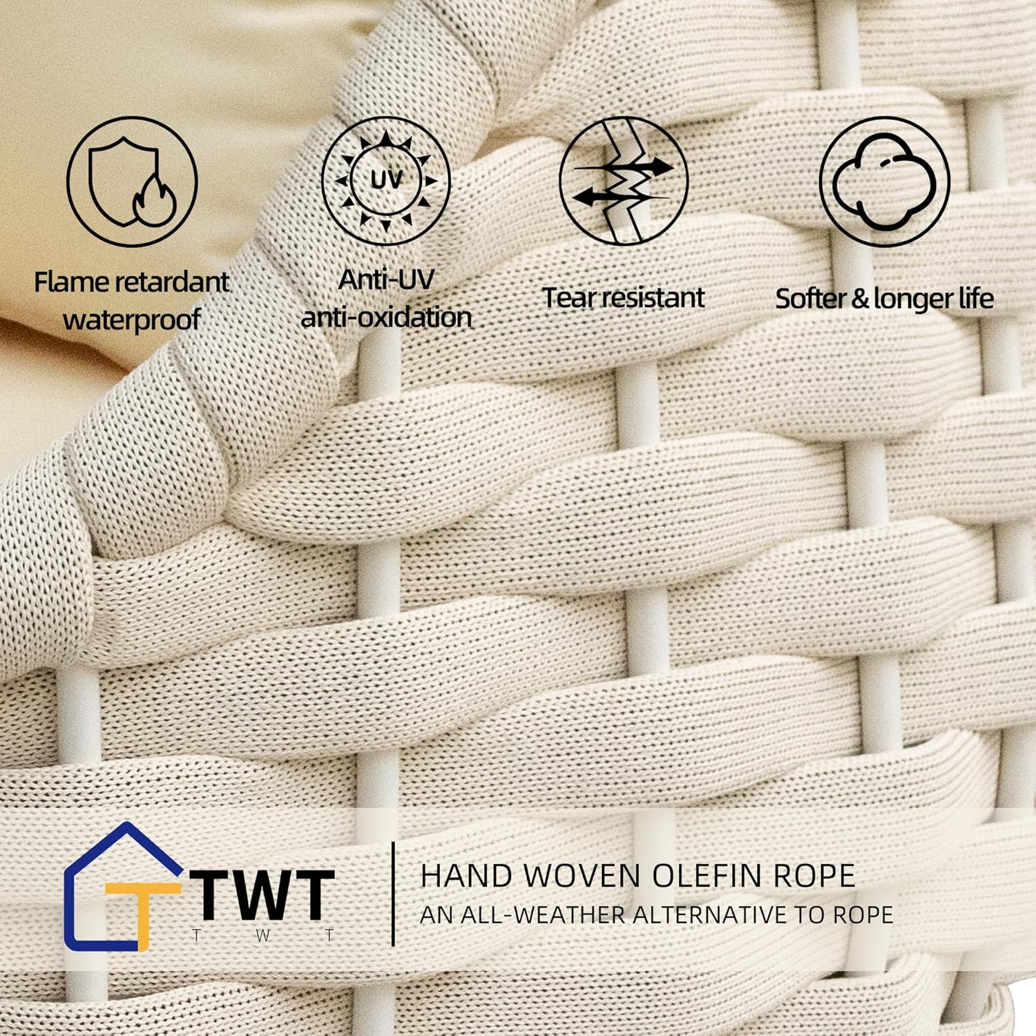 TWT Outdoor 3-Piece Conversation Set Rust Free Patio Furniture Set Already Assembled Compact-Weave Rope Olefin Modern Sofa Seating with Thick & Washable Cushions for Indoor, Backyard, Balcony, Cream