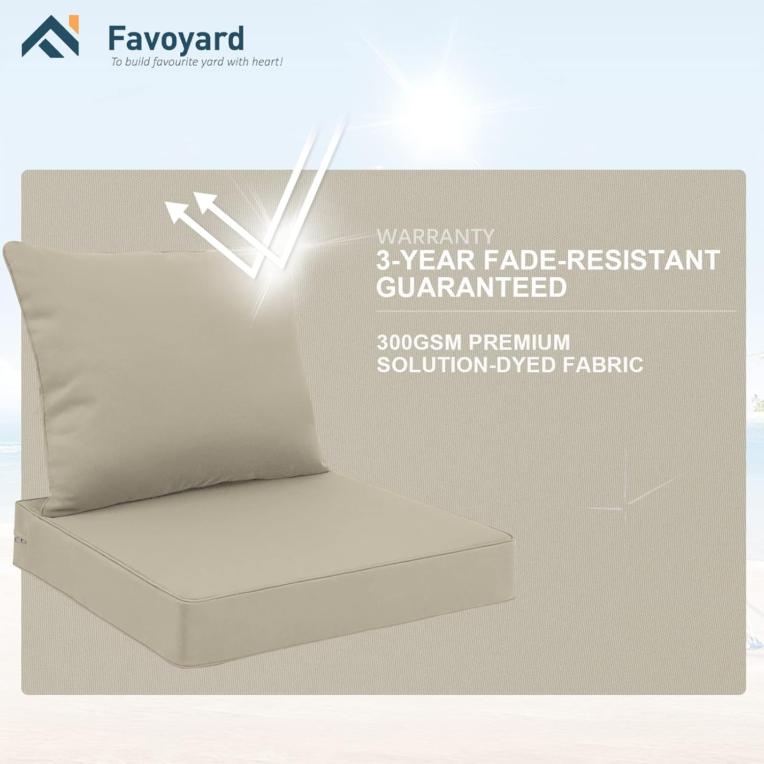 - 3-Year Fade Resistance Fabric: Our Favoyard outdoor chair cushions is made of solution-dyed fabric. This kind of fabric usually used with outdoor circumstance because of it’s color fastness. With the help of the fabric our patio furniture cushion could last 3 years color fastness. And we are confident our cushions could withstand at least 1500h intense midday sunlight.